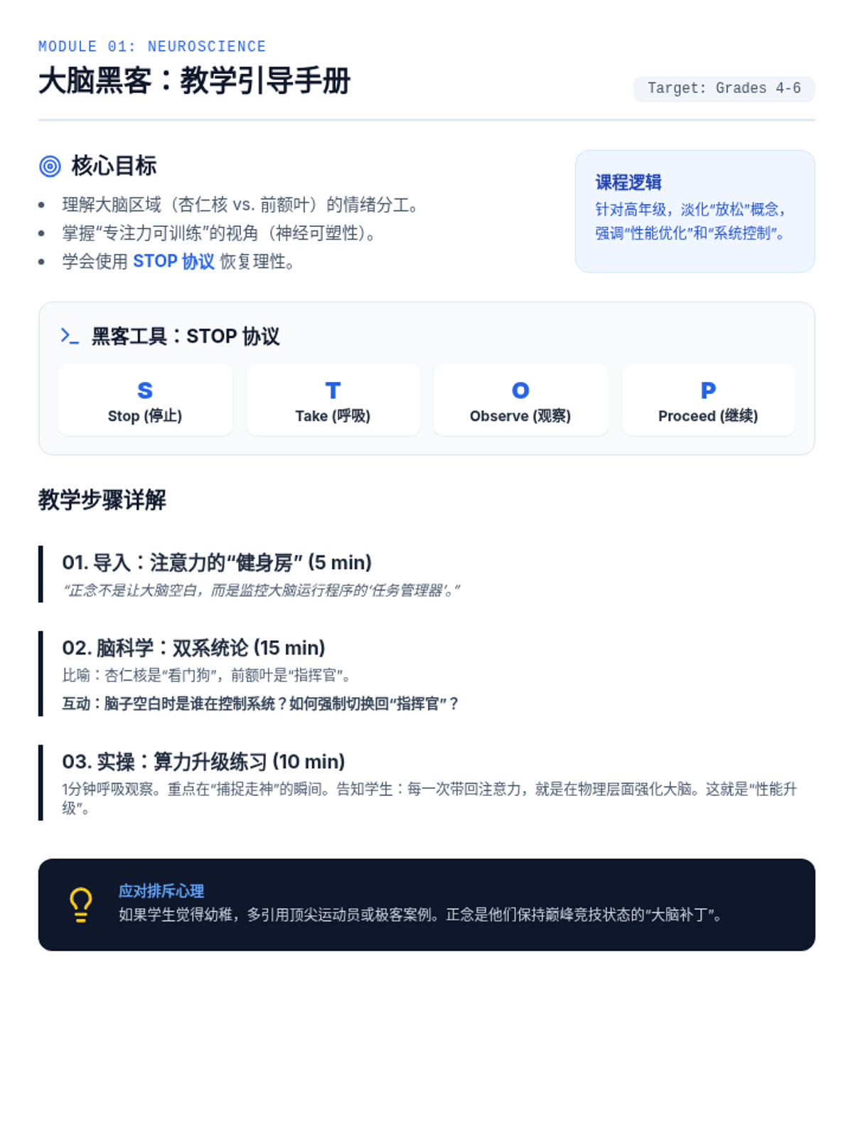Teacher's facilitation guide for the 'Brain Hackers' lesson (Grades 4-6). Revised to ensure all content fits on a single page, improve text contrast for printing, and fix icon rendering issues. Content remains professionally sophisticated for the age group.