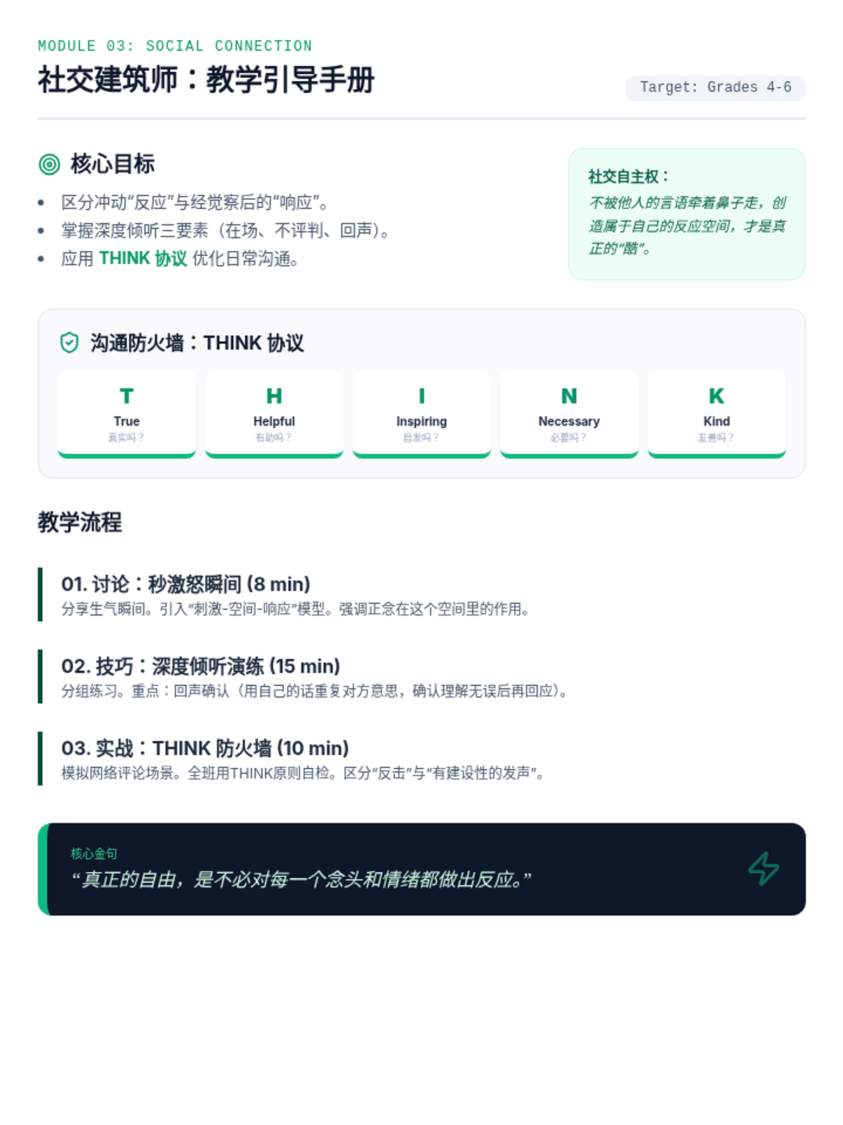 Teacher's facilitation guide for the 'Connection Architects' lesson (Grades 4-6). Revised to define the THINK protocol, fix title consistency, and consolidate all content onto a single page. Layout tightened to prevent orphaned quotes and sections split across pages.