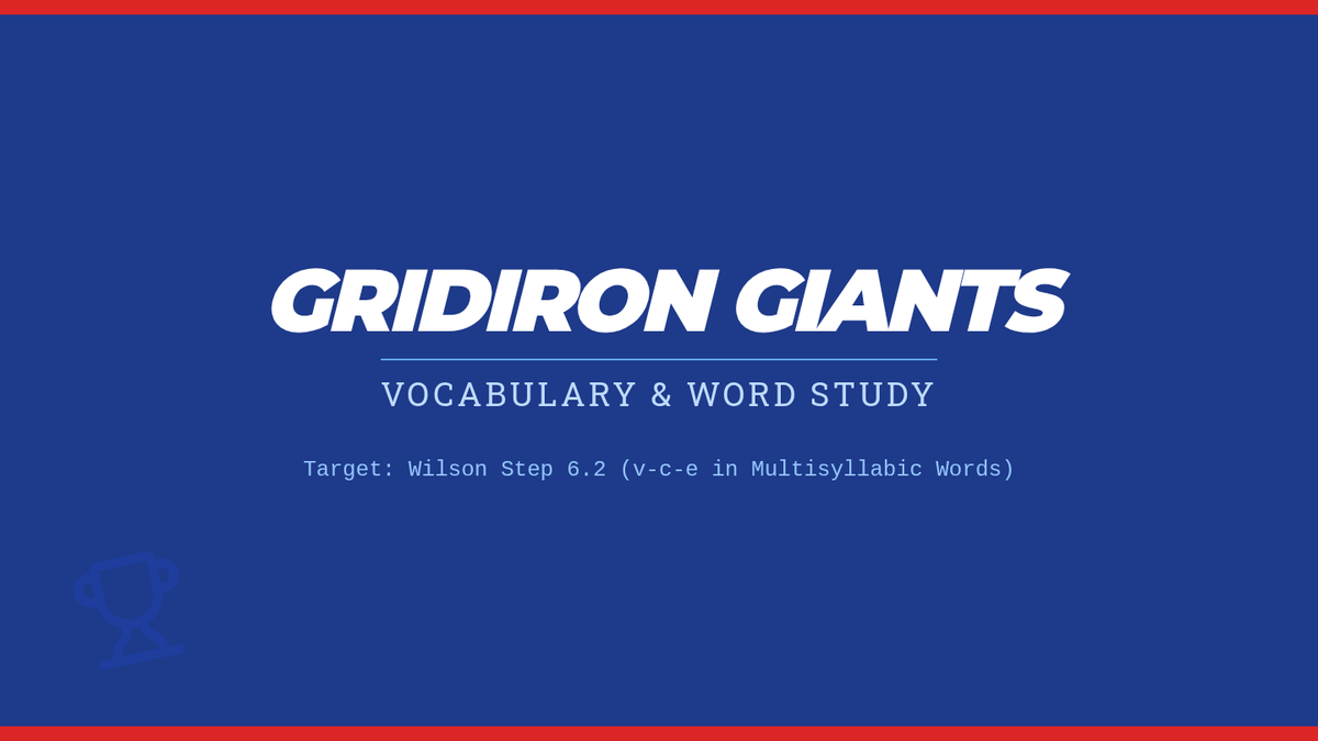 A presentation introducing multisyllabic v-c-e words (Wilson 6.2) and Tier 2 academic vocabulary from the Dametrious Crownover reading passage. Each slide features syllable breakdowns, definitions, and context sentences.