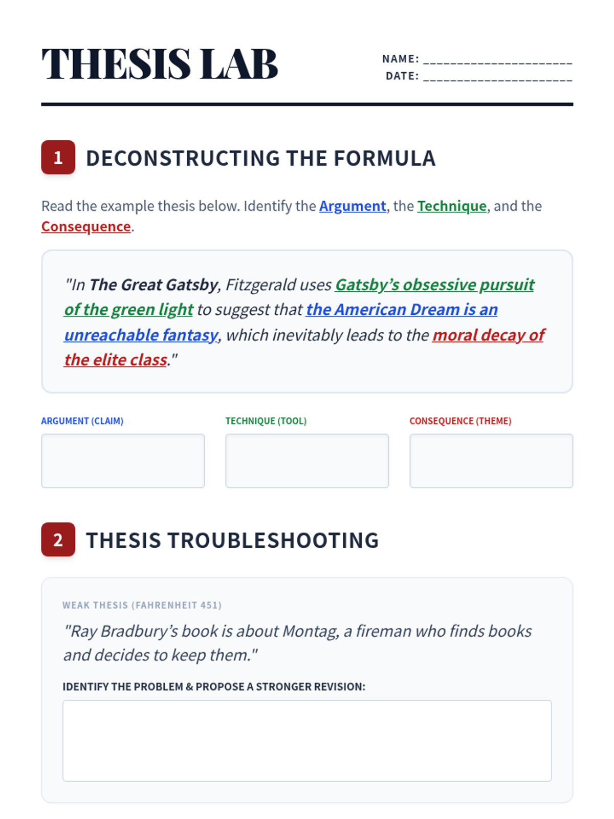 A student-facing worksheet for practicing the identification and drafting of thesis statements. Includes 'troubleshooting' exercises and prompt-based drafting areas.