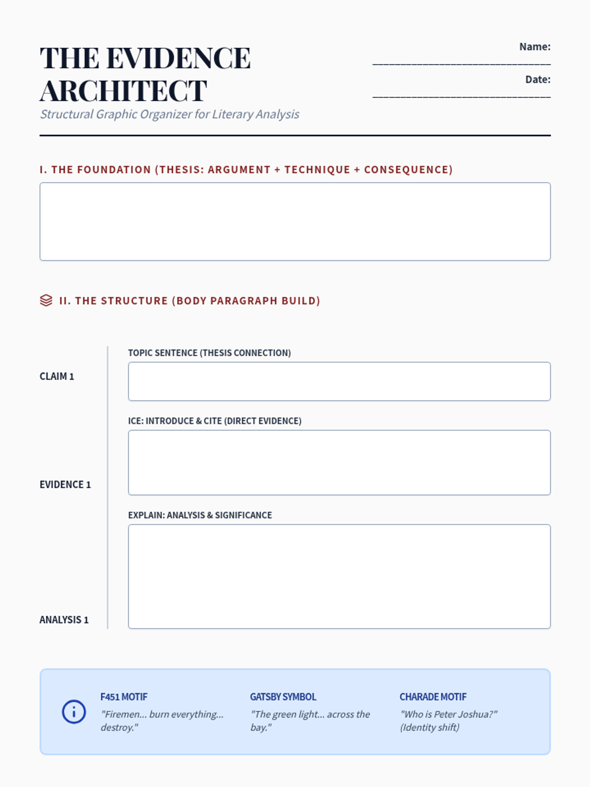 A structured graphic organizer for students to architect their literary analysis essays, providing clear sections for claims, evidence, and analysis using a 'building' metaphor.