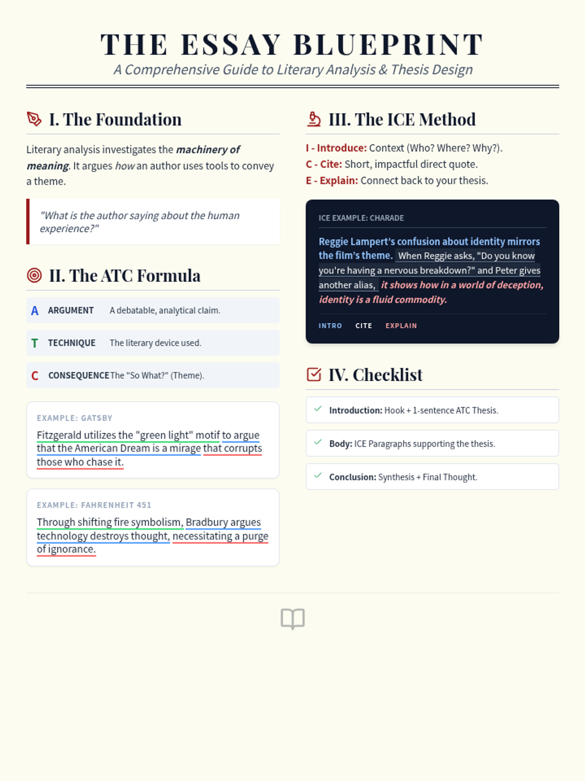 A comprehensive writing guide that breaks down the components of a literary essay, provides the 'ATC' formula for thesis statements, and uses examples from The Great Gatsby, Fahrenheit 451, and Charade.