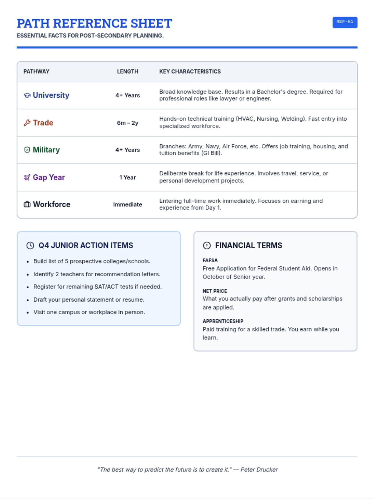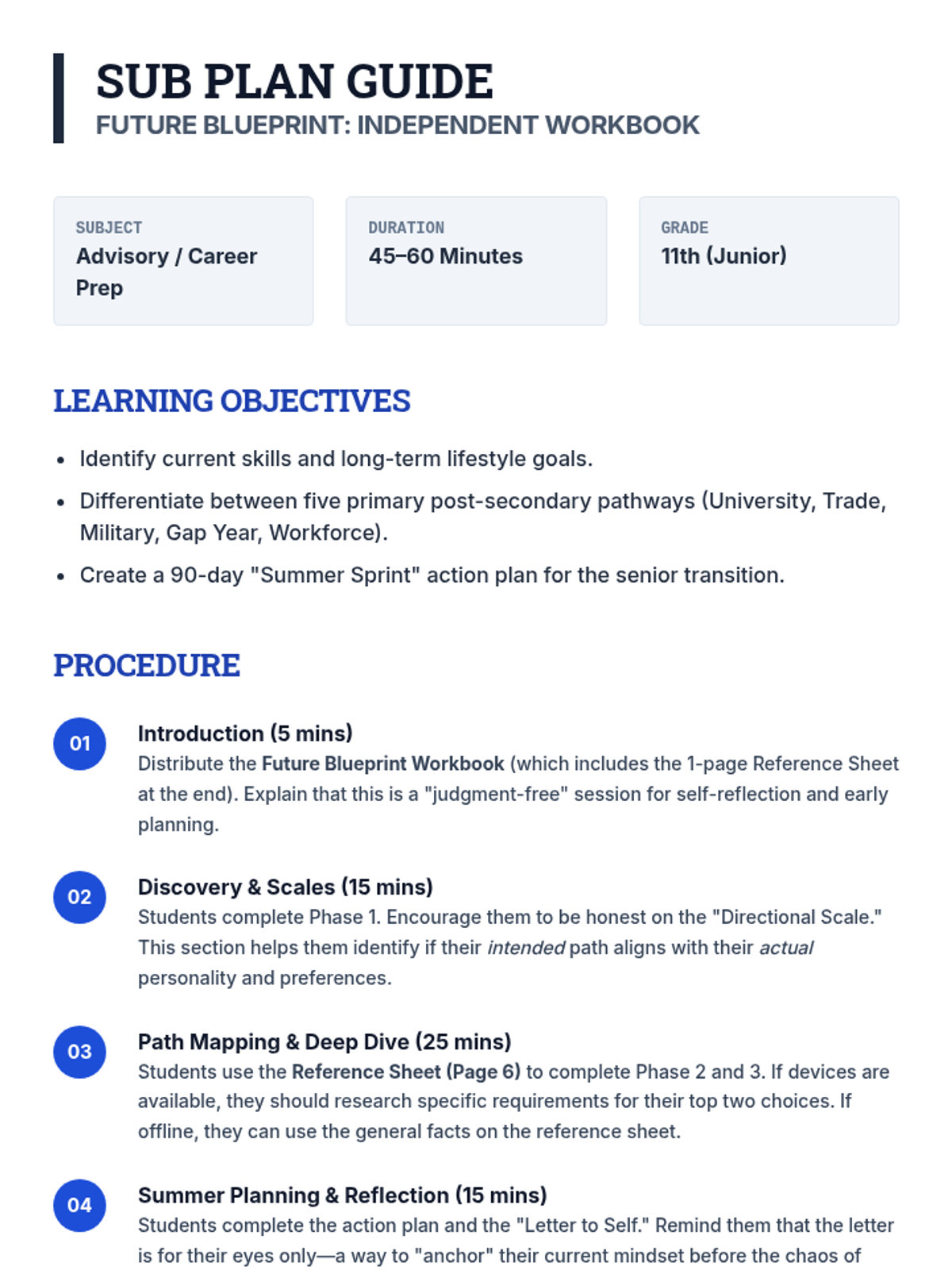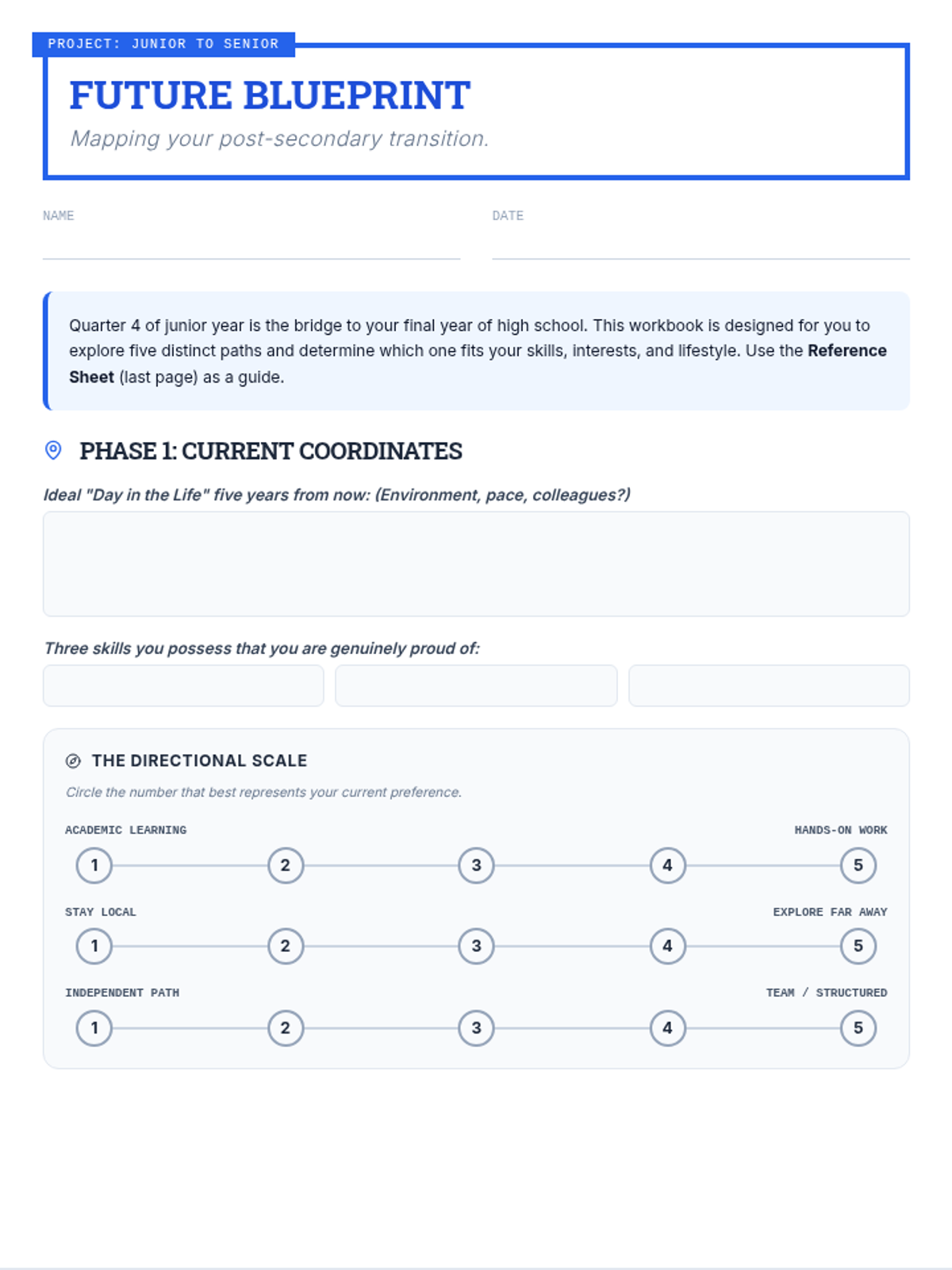 A comprehensive 6-page student workbook packet designed for independent completion. It guides students through self-reflection, comparative research (using the integrated reference sheet), summer planning, and future-self reflection. Adjusted for better legibility and response area height.