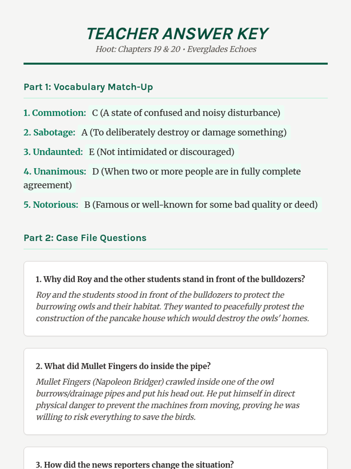 Teacher answer key for the Chapters 19 and 20 Hoot worksheet, including vocabulary definitions and suggested responses for comprehension questions.
