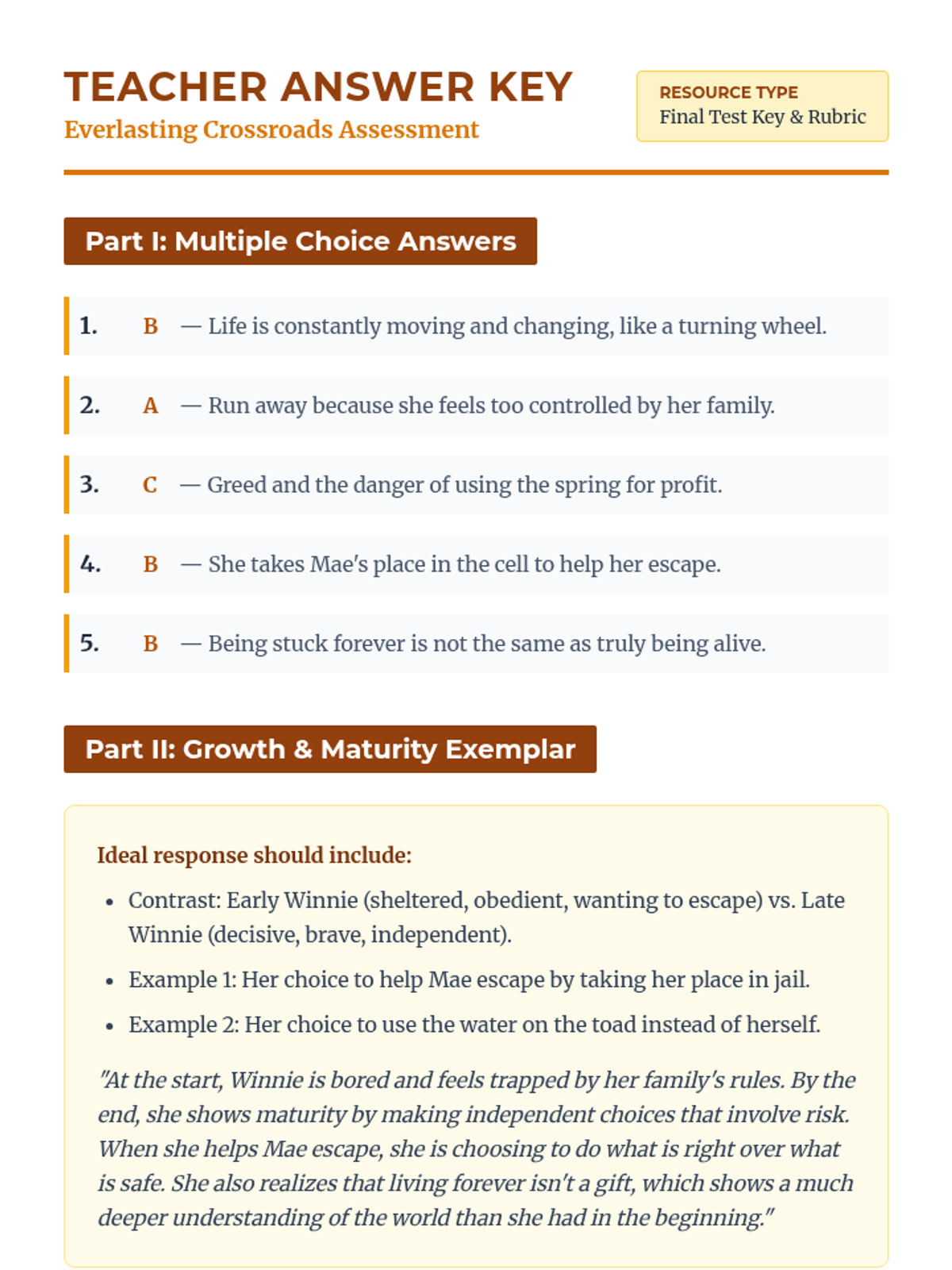 An answer key and grading rubric for the Tuck Everlasting final assessment, including exemplar responses for short answer and essay questions.