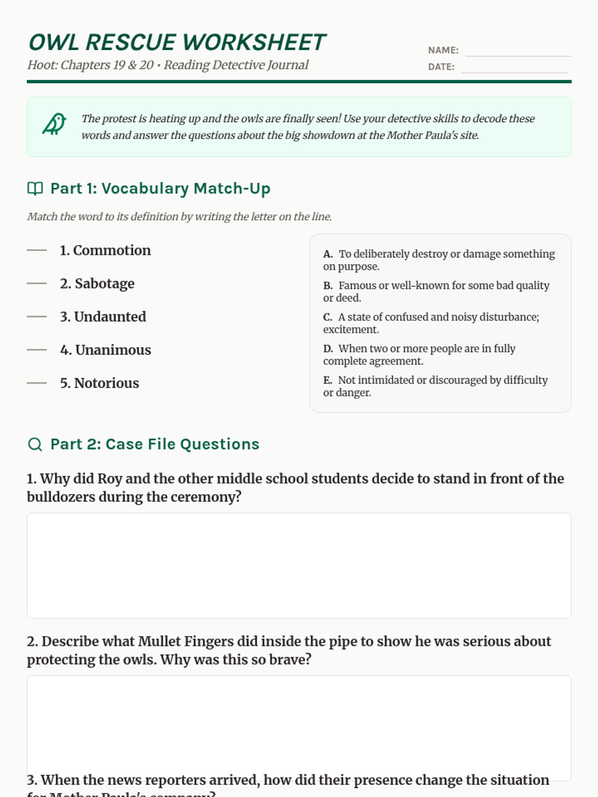 A comprehension and vocabulary worksheet for Chapters 19 and 20 of Hoot, featuring matching exercises and open-ended analysis questions for 4th-grade students. Revised for better page breaks and writing space.