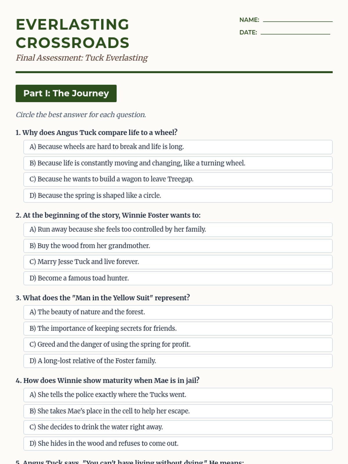 A 2-page final assessment for Tuck Everlasting featuring multiple choice questions and essay prompts. Revised for better page flow and writing space.
