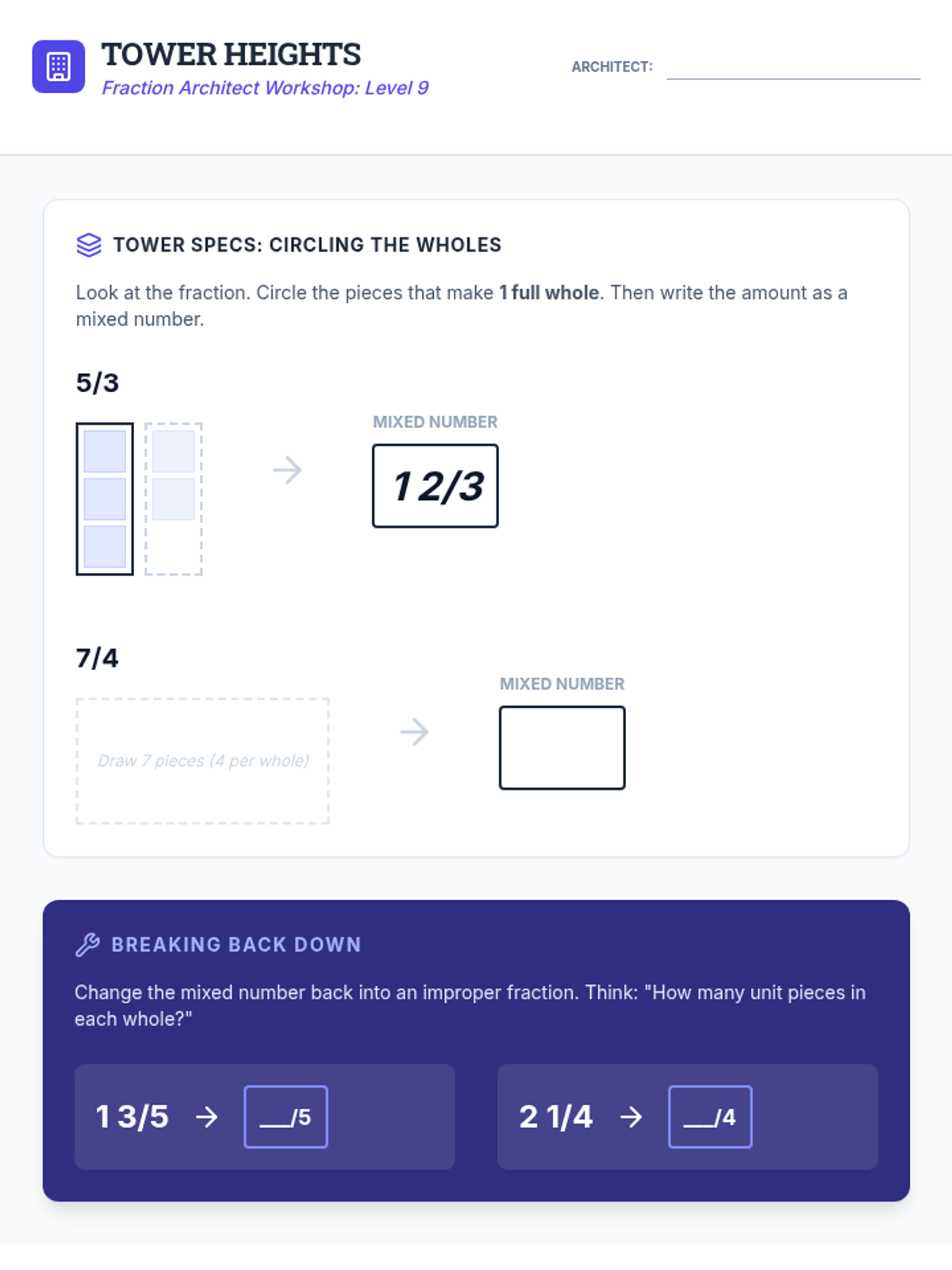 Student worksheet for Lesson 9: Tower Heights, focusing on converting between improper fractions and mixed numbers using visual models.