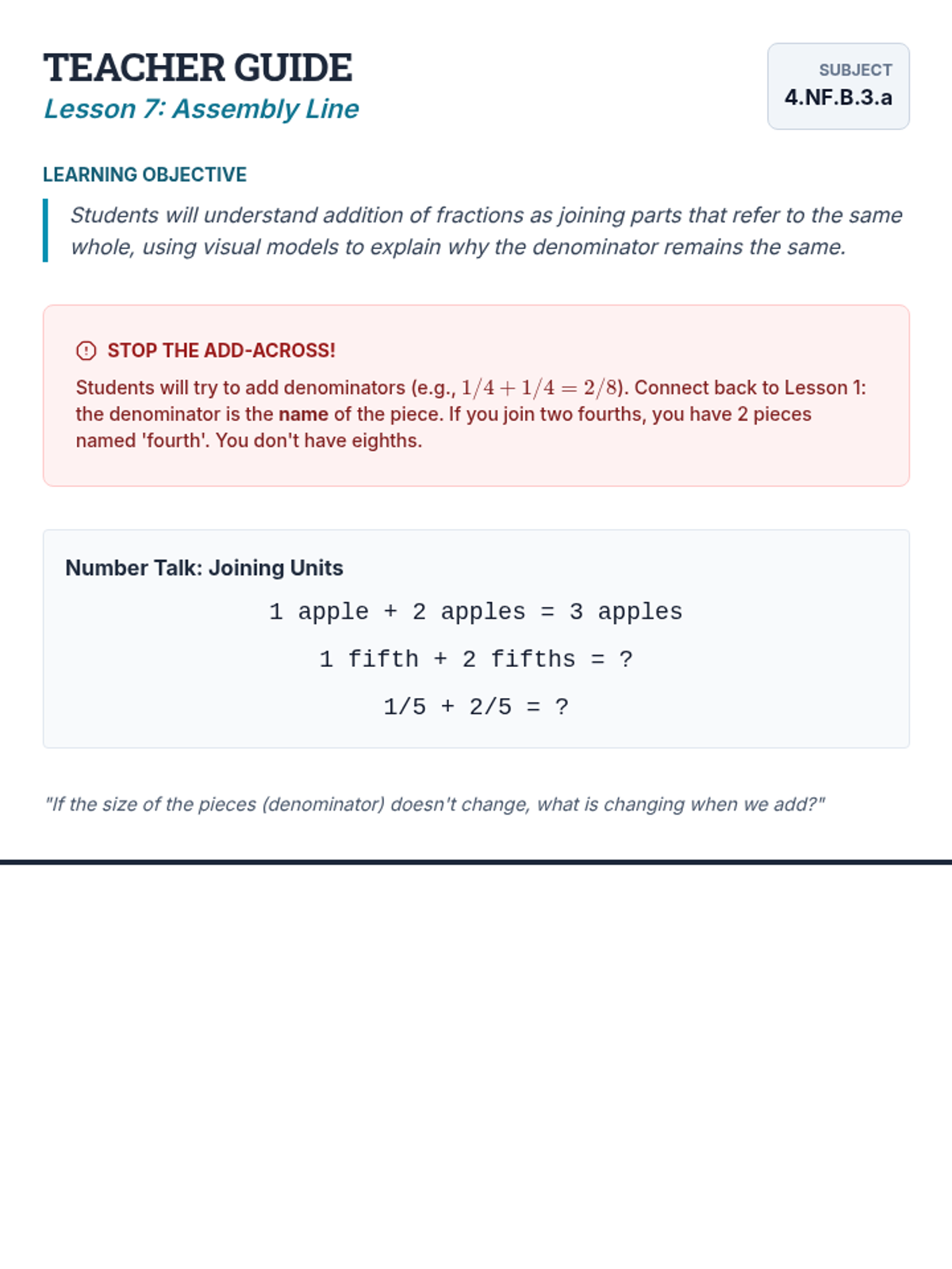 Teacher Guide for Lesson 7: Assembly Line, focusing on adding fractions with like denominators using the joining concept.