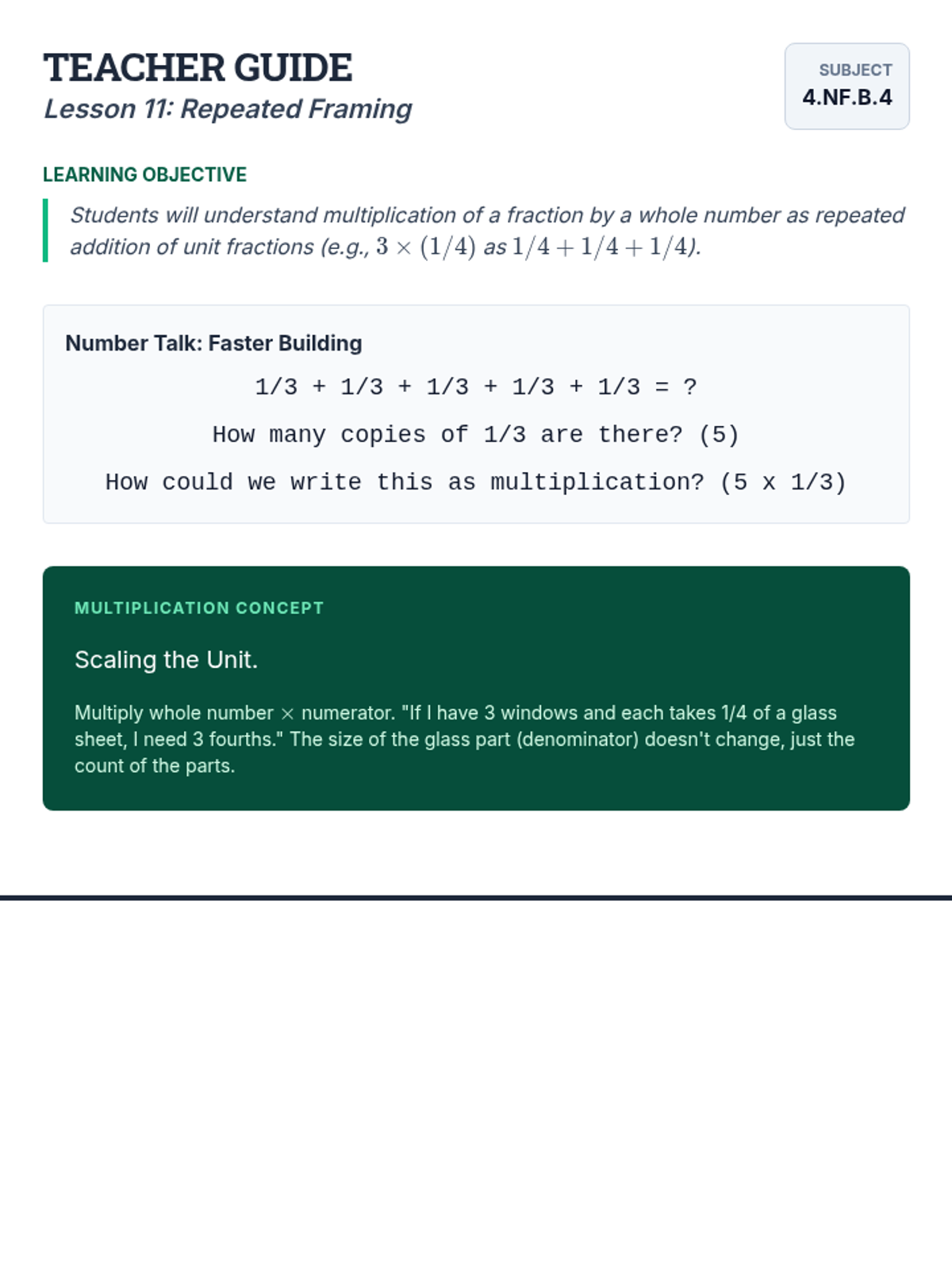 Teacher Guide for Lesson 11: Repeated Framing, focusing on fraction multiplication as repeated addition.