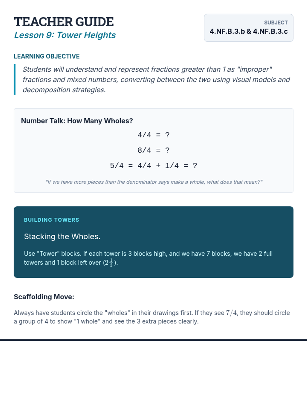 Teacher Guide for Lesson 9: Tower Heights, focusing on fractions greater than 1 and mixed numbers.