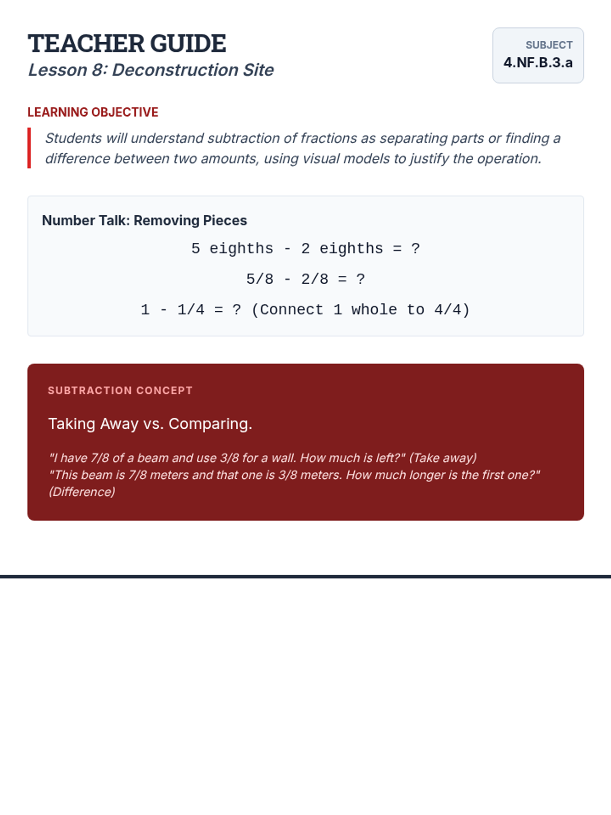 Teacher Guide for Lesson 8: Deconstruction Site, focusing on subtracting fractions with like denominators.