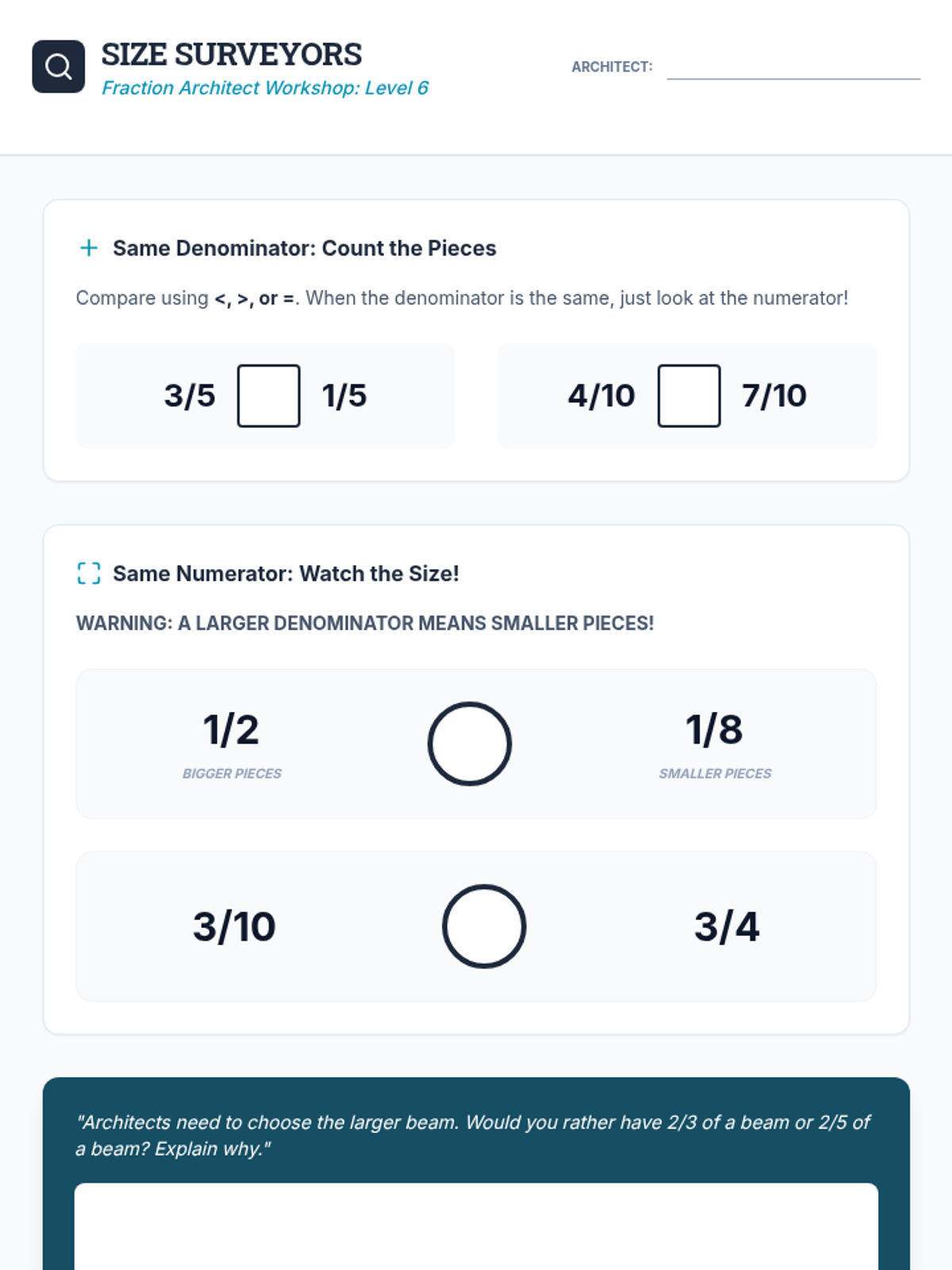 Student worksheet for Lesson 6: Size Surveyors, focusing on comparing fractions using reasoning about piece size and number of pieces.