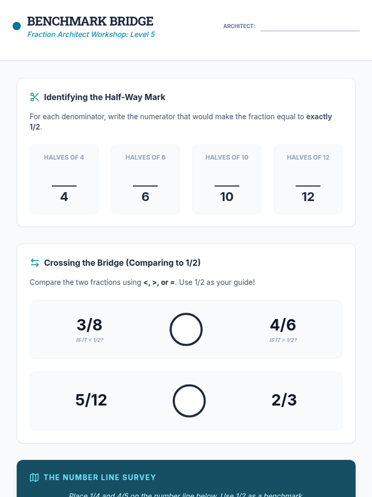 Student worksheet for Lesson 5: Benchmark Bridge, focusing on comparing fractions using 1/2 as a benchmark.