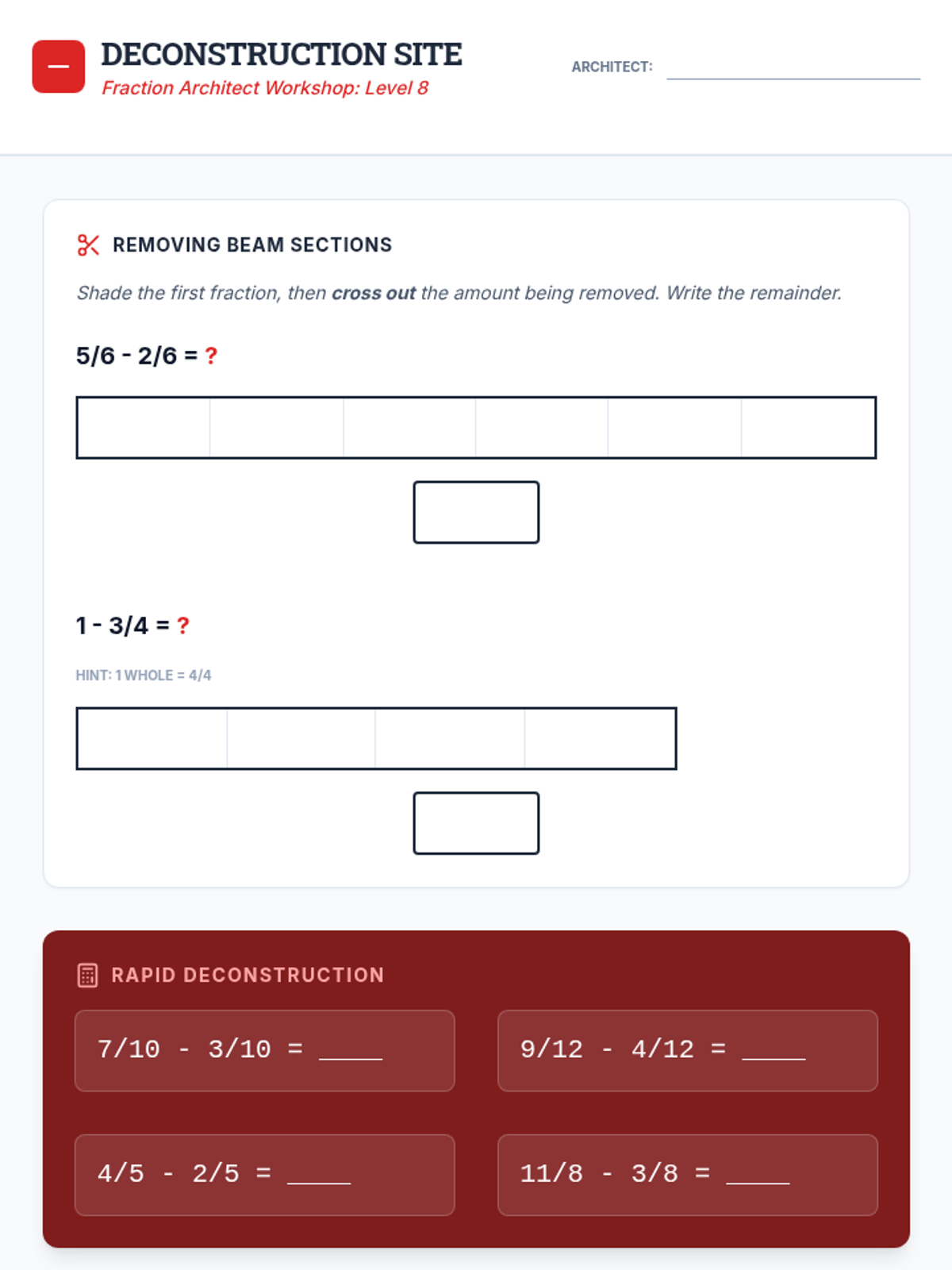 Student worksheet for Lesson 8: Deconstruction Site, focusing on subtracting fractions with like denominators through visual models.