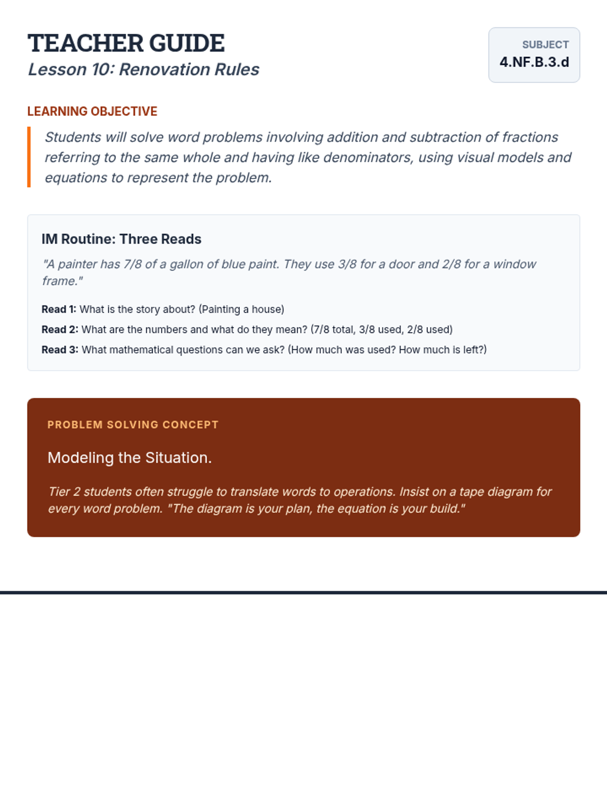 Teacher Guide for Lesson 10: Renovation Rules, focusing on solving fraction word problems.