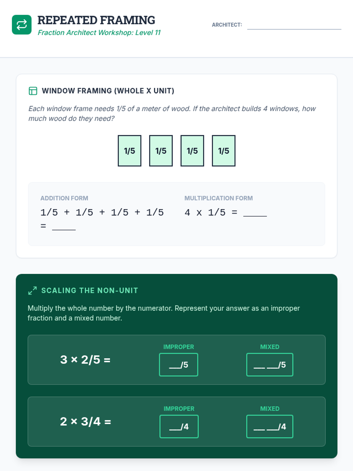 Student worksheet for Lesson 11: Repeated Framing, focusing on multiplying fractions by whole numbers using architectural word problems.