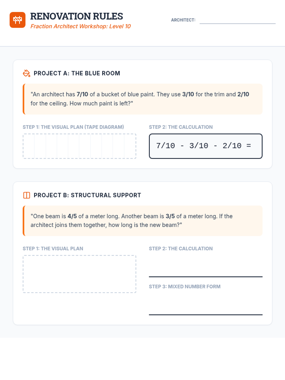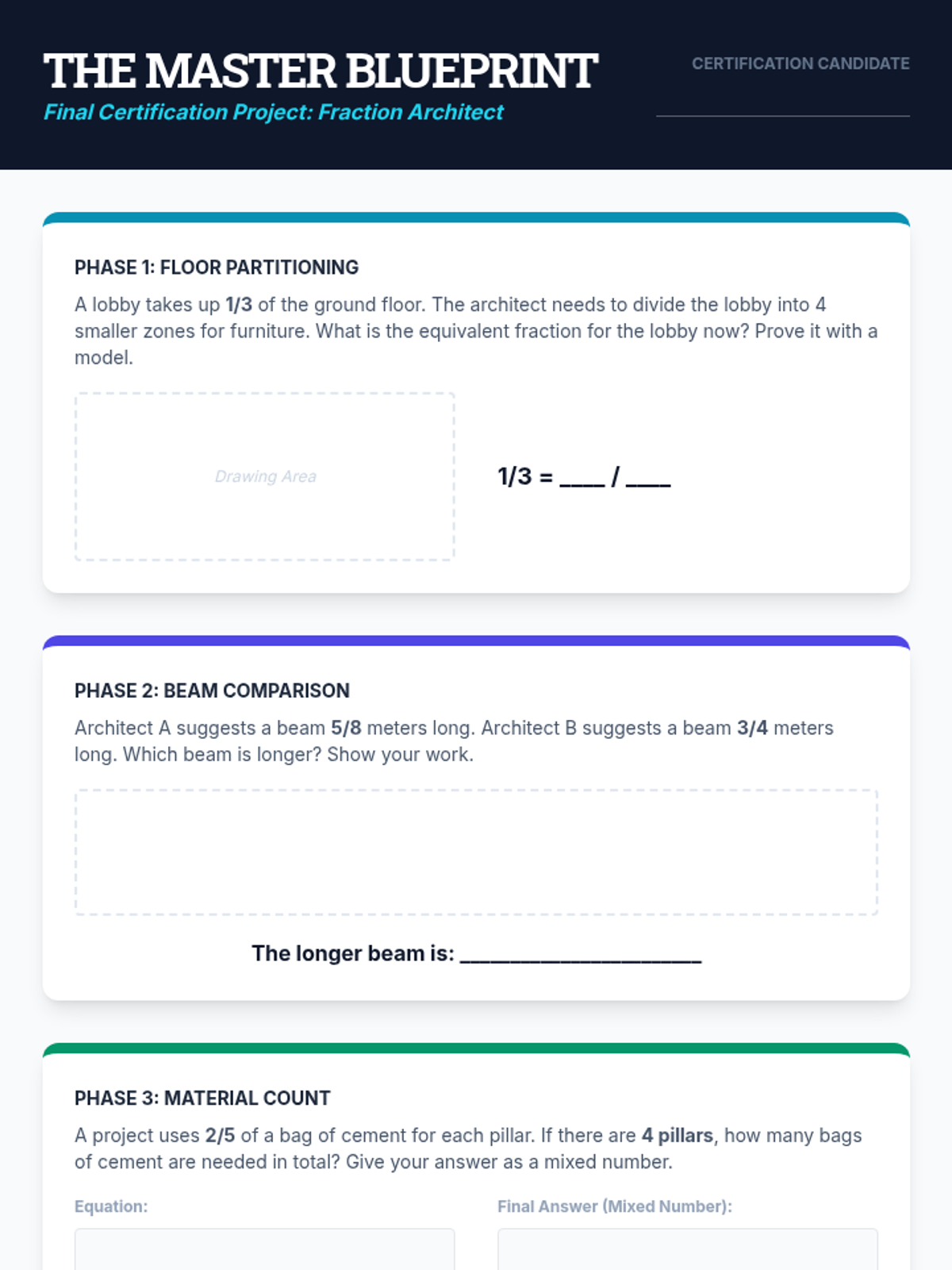 Final performance task for the Fraction Architect sequence, requiring students to apply multiple fraction skills to a single architectural project.