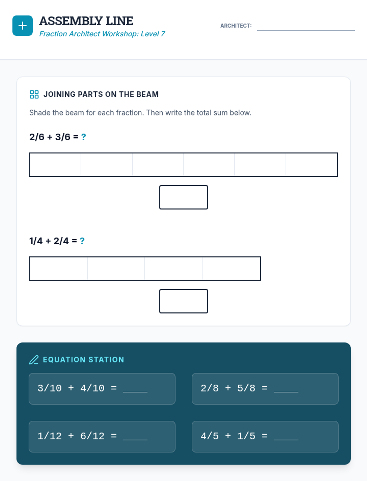 Student worksheet for Lesson 7: Assembly Line, focusing on adding fractions with like denominators using visual models.