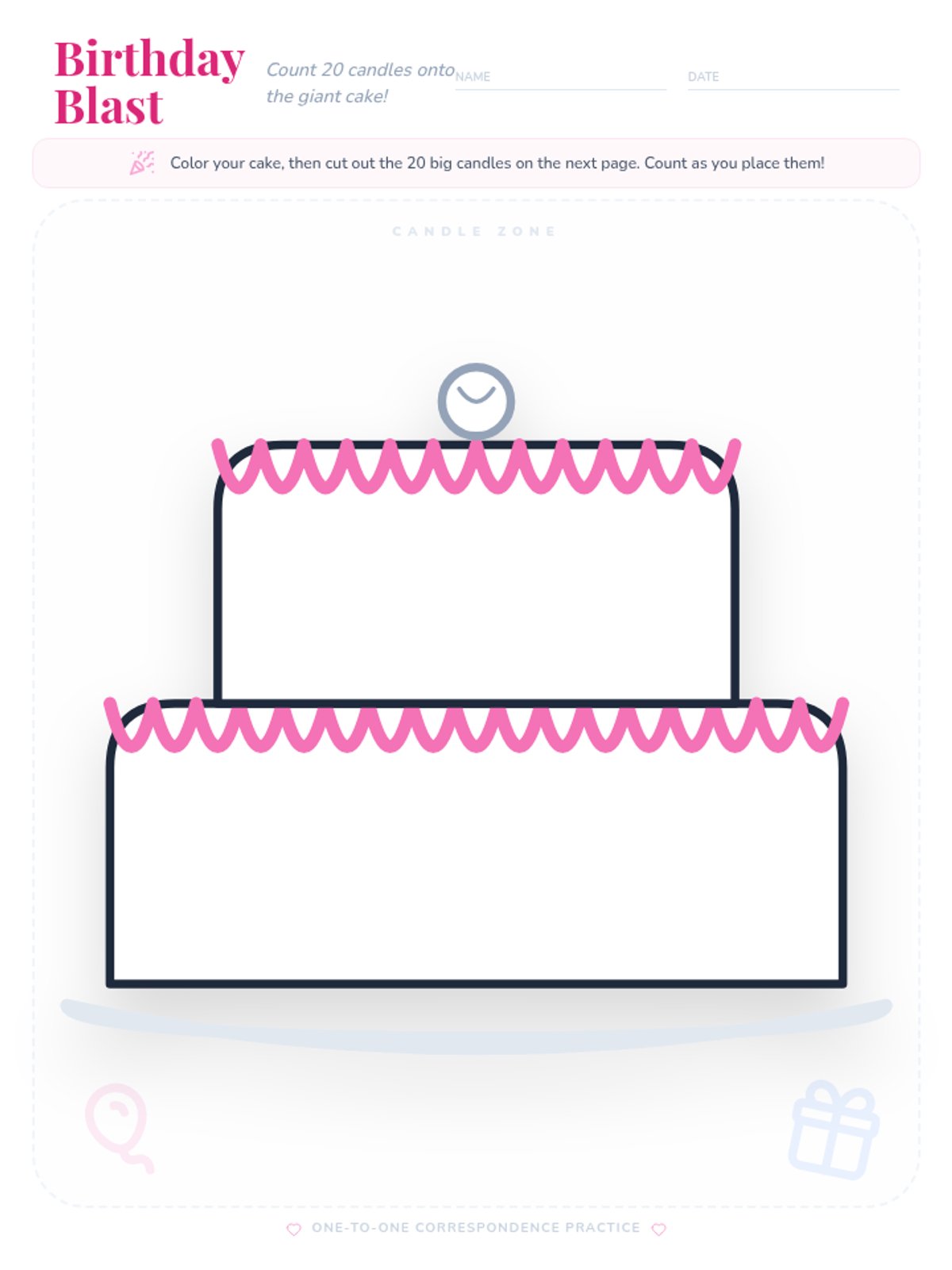 A revised version of the math warm-up with significantly enlarged candles for easier cutting and coloring, and a massive birthday cake to accommodate all 20 candles.