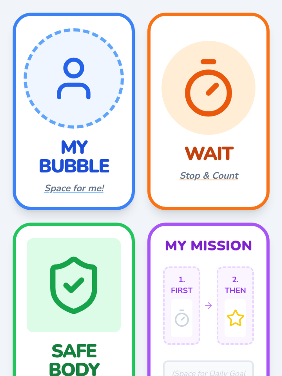 A highly visual, 5-page workbook for students with severe ID, focusing on personal space, waiting, and choosing safe behaviors through simple icons and large tracking areas. Revised for icon consistency.
