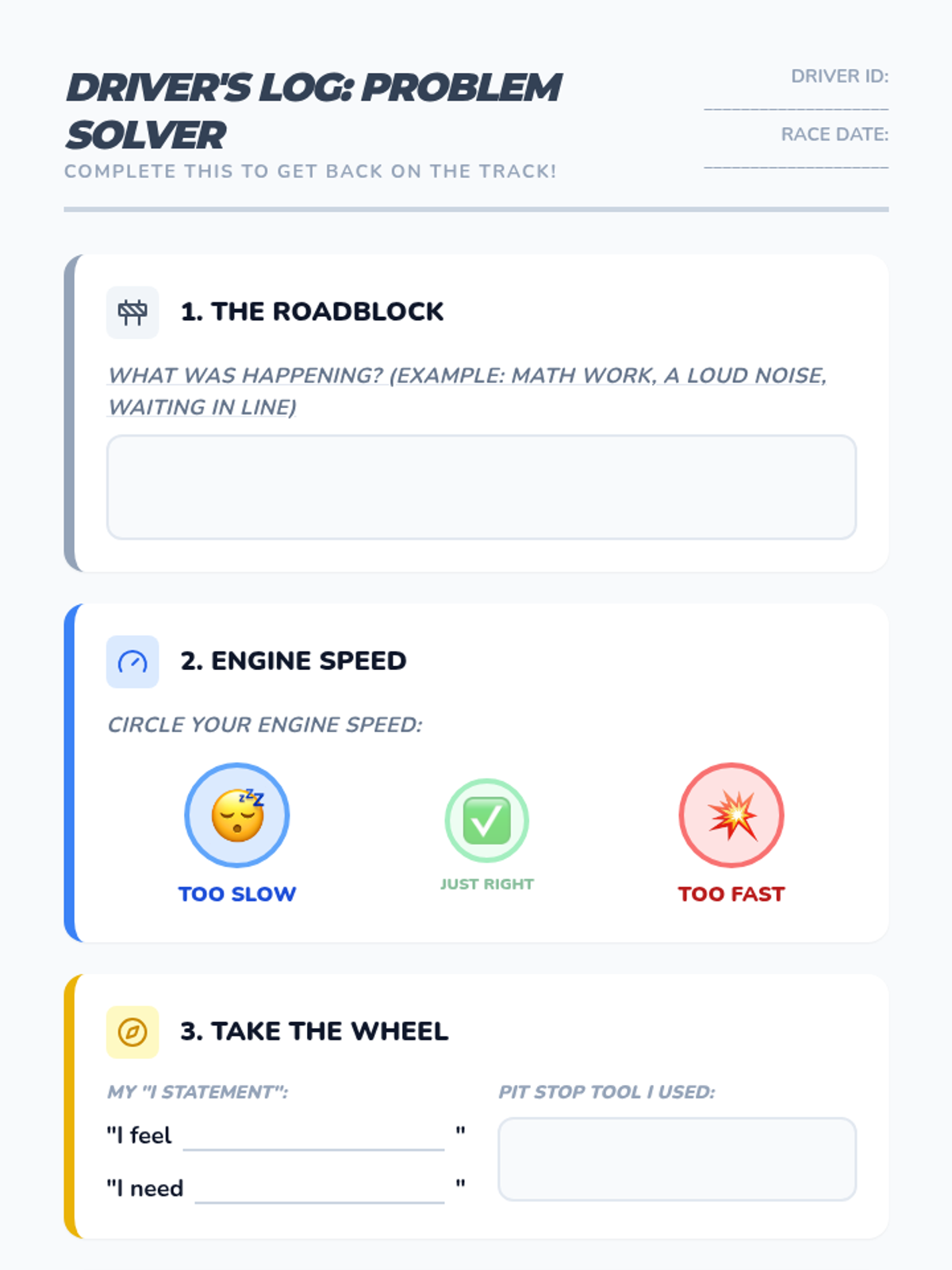 A graphic organizer for students to walk through a problem-solving process when they feel their emotional engine is running too fast or too slow.