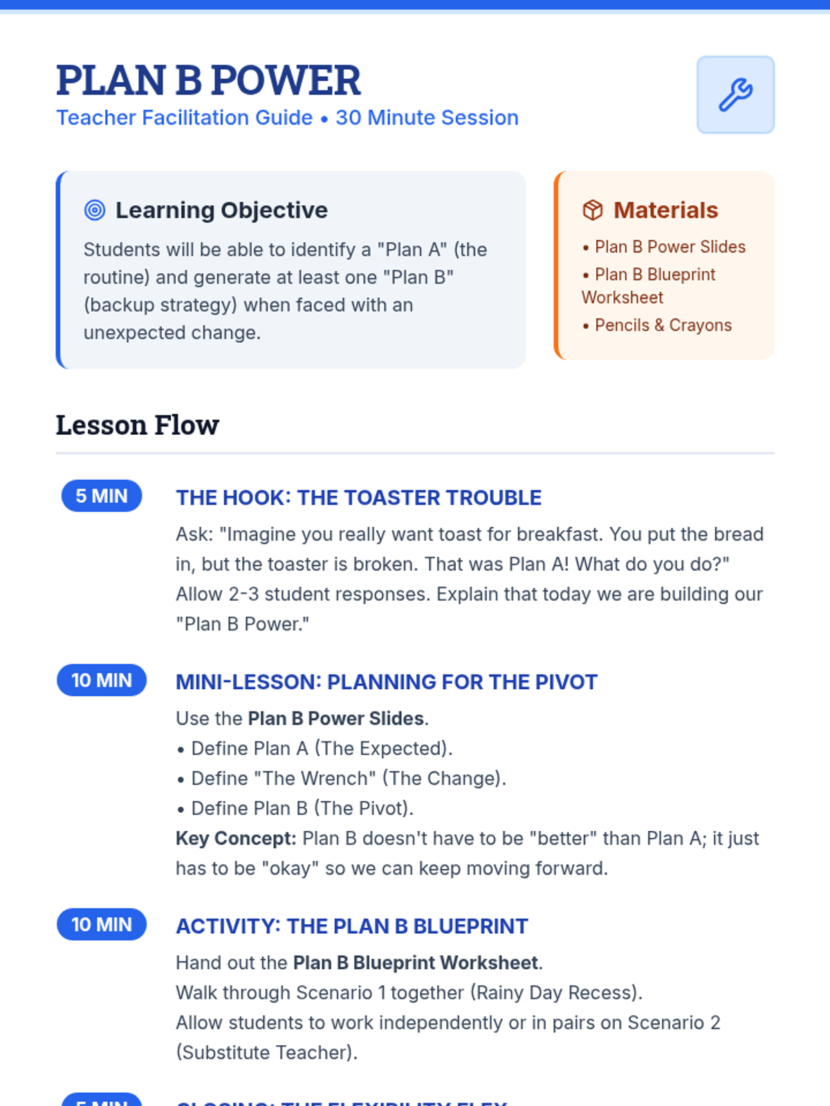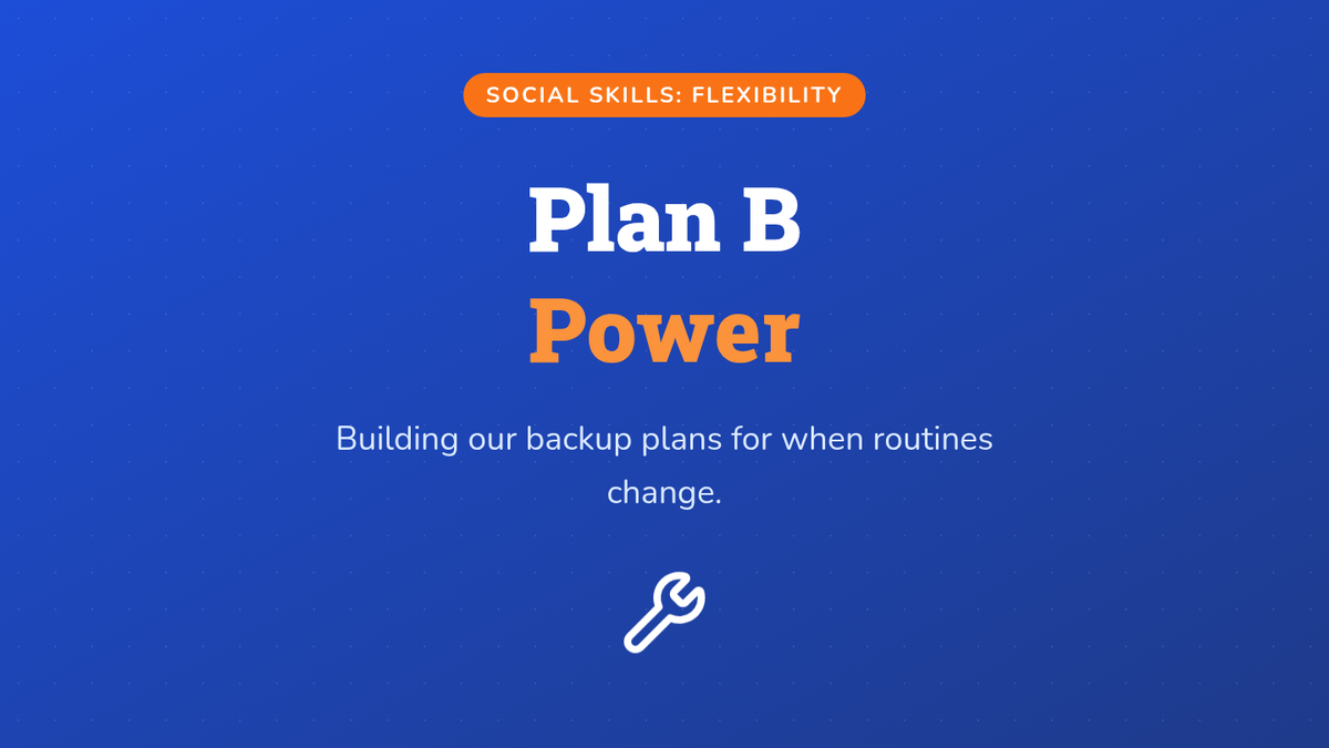 A visually engaging slide deck that teaches the concepts of Plan A (routine), the 'Wrench' (change), and Plan B (backup). Features clear definitions, visual metaphors, and a guided practice scenario to build students' social-emotional flexibility.