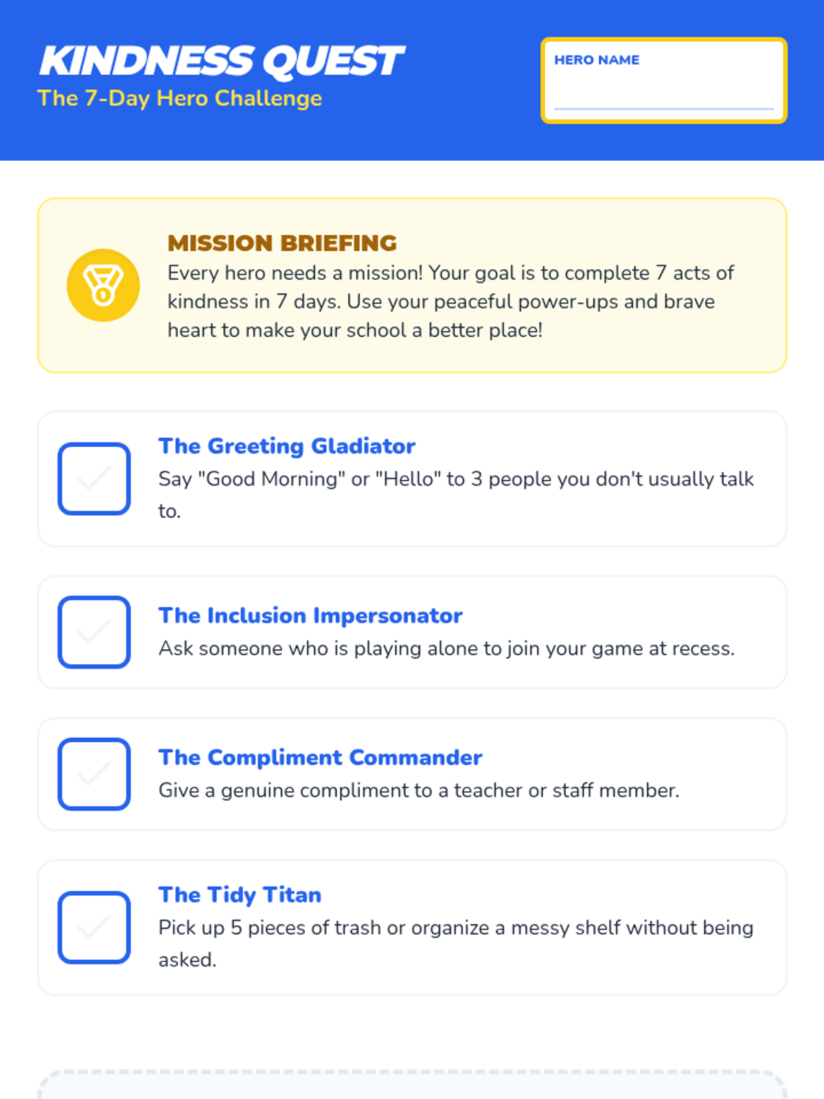 A student-facing 7-day kindness challenge guide with actionable missions like inclusion, compliments, and community service, including a space for reflective journaling.