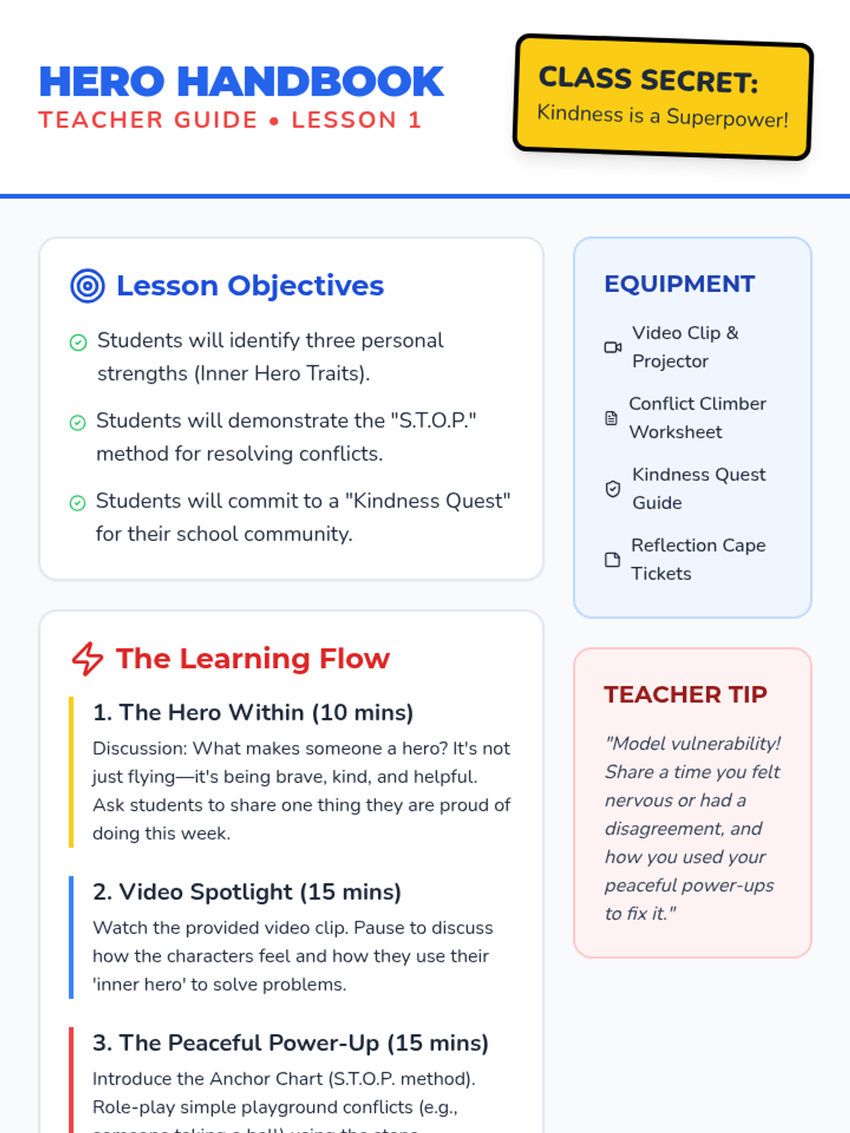 A comprehensive teacher guide for the 'Inner Hero Academy' lesson, including a detailed learning flow, instructional tips, and a large-scale 'S.T.O.P.' conflict resolution anchor chart designed for classroom display.