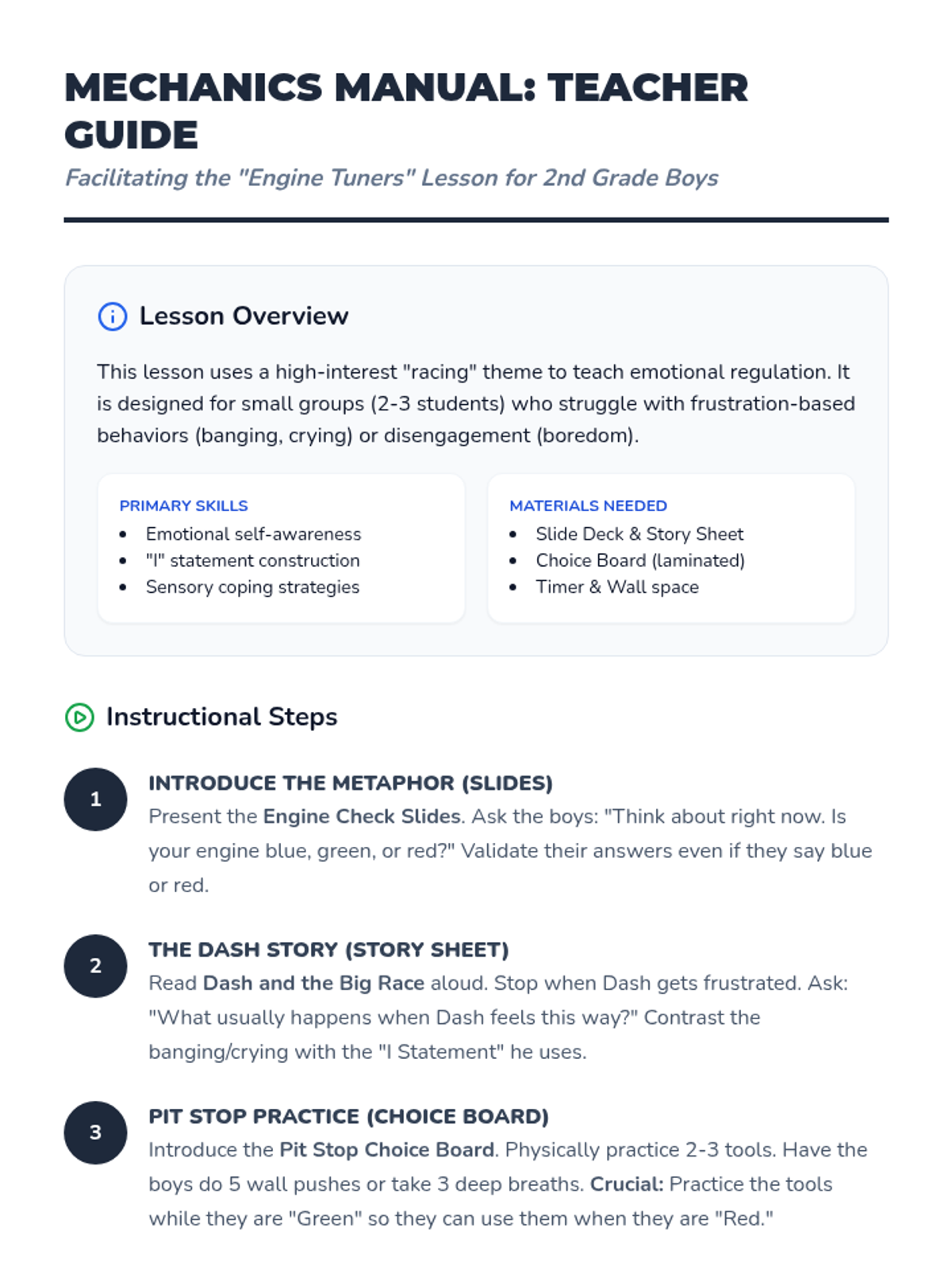 A comprehensive instructional guide for teachers to deliver the Engine Tuners lesson, including instructional sequences, discussion prompts, and facilitation tips.
