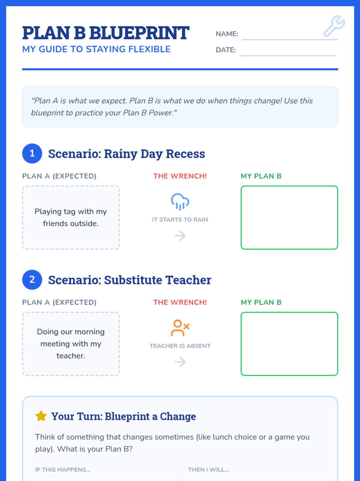A student worksheet designed as a 'blueprint' for practicing social flexibility. Students identify 'Plan B' options for common school scenarios (Rainy Day, Substitute Teacher) and create their own personal backup plan for an unexpected change.