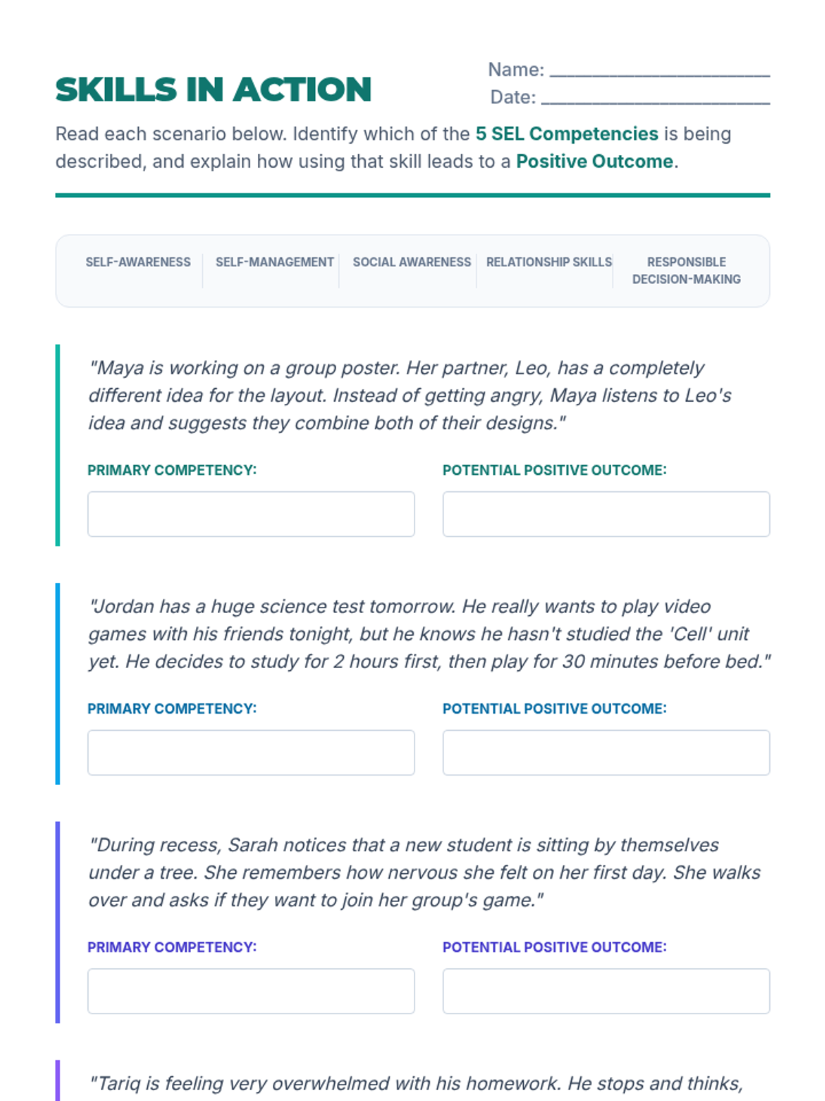 A worksheet featuring four realistic school scenarios where students must identify the applicable CASEL competency and predict a positive outcome.