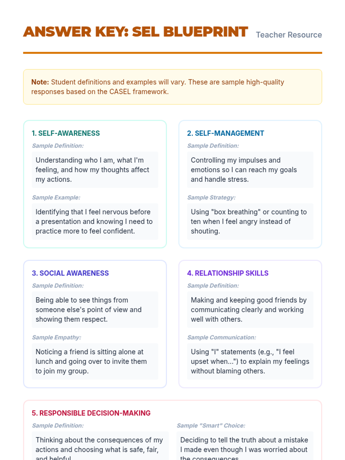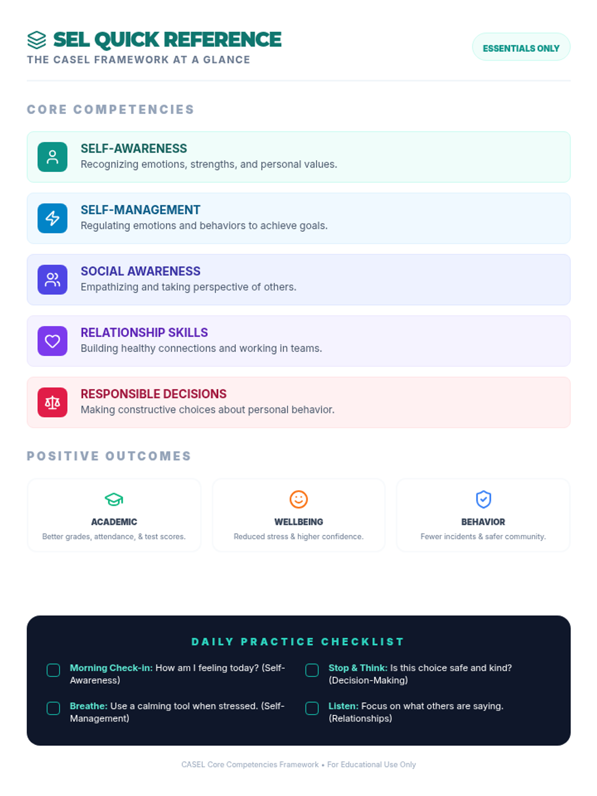 A single-page quick reference sheet summarizing the 5 SEL competencies and 3 positive outcomes with concise definitions and daily practice tips.
