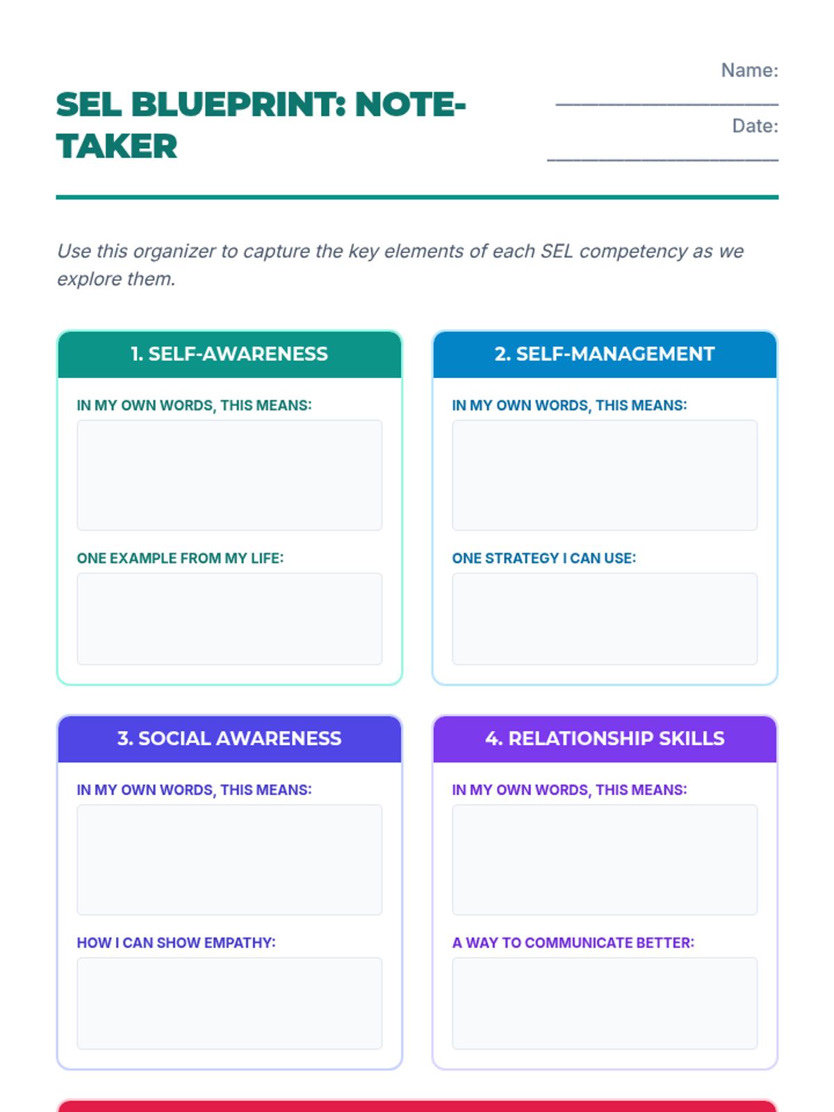 A 2-page graphic organizer for students to take notes on the 5 SEL competencies and 3 positive outcomes, including space for personal reflection and goal setting.