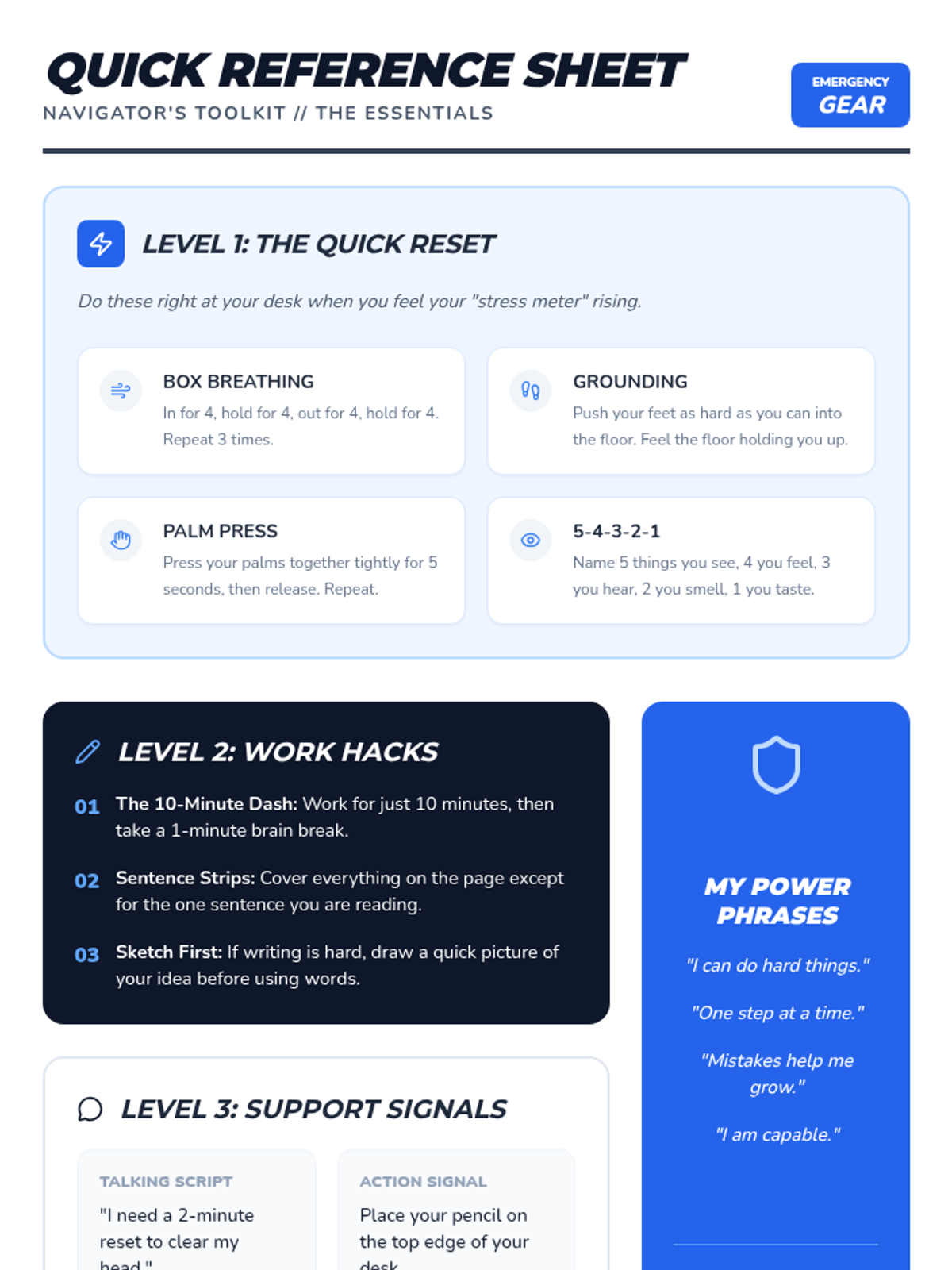 A one-page 'cheat sheet' for a student to quickly reference physical, mental, and communication-based coping strategies during stressful moments in ELA.