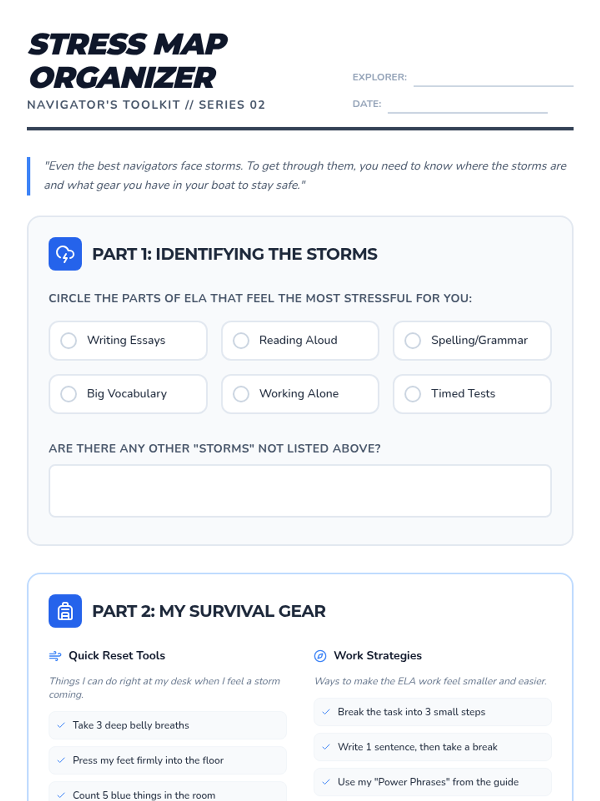 A graphic organizer to help a 5th-grade student identify specific ELA-related stressors ('storms') and match them with practical coping mechanisms ('gear').