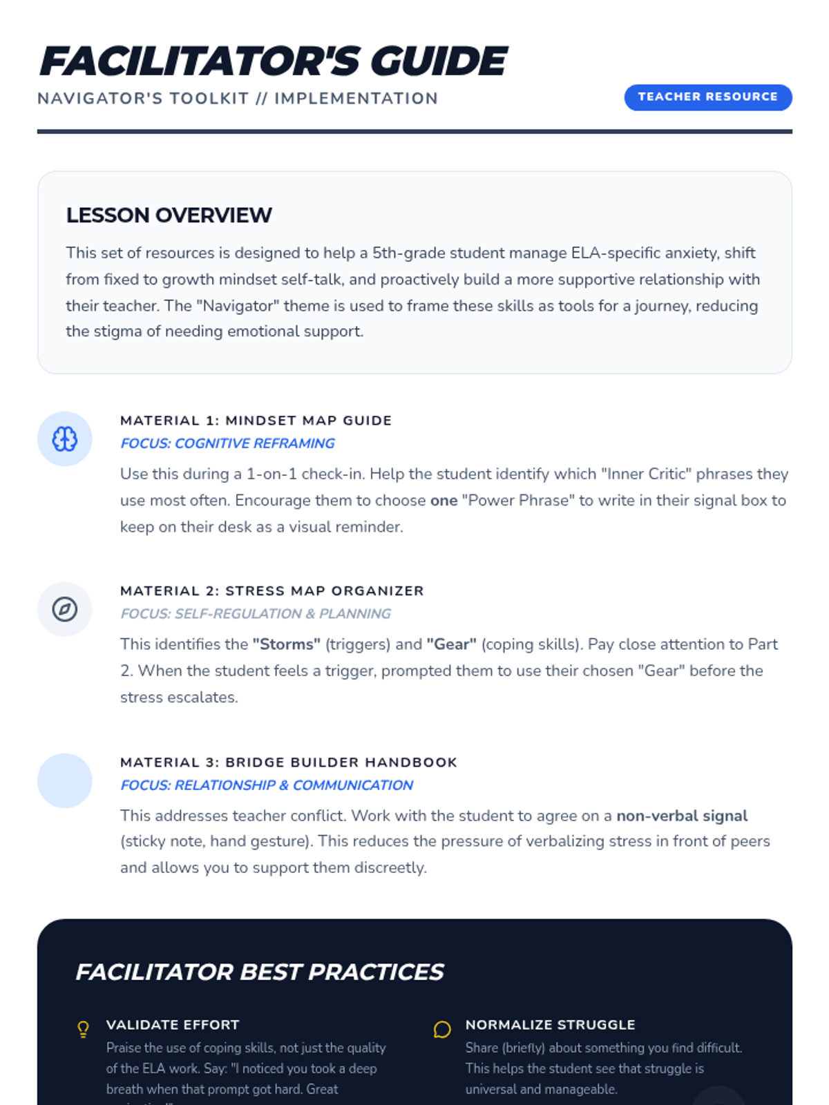A one-page facilitation guide for teachers to help implement the Navigator's Toolkit, including specific strategies for supporting students with ELA anxiety and communication barriers.