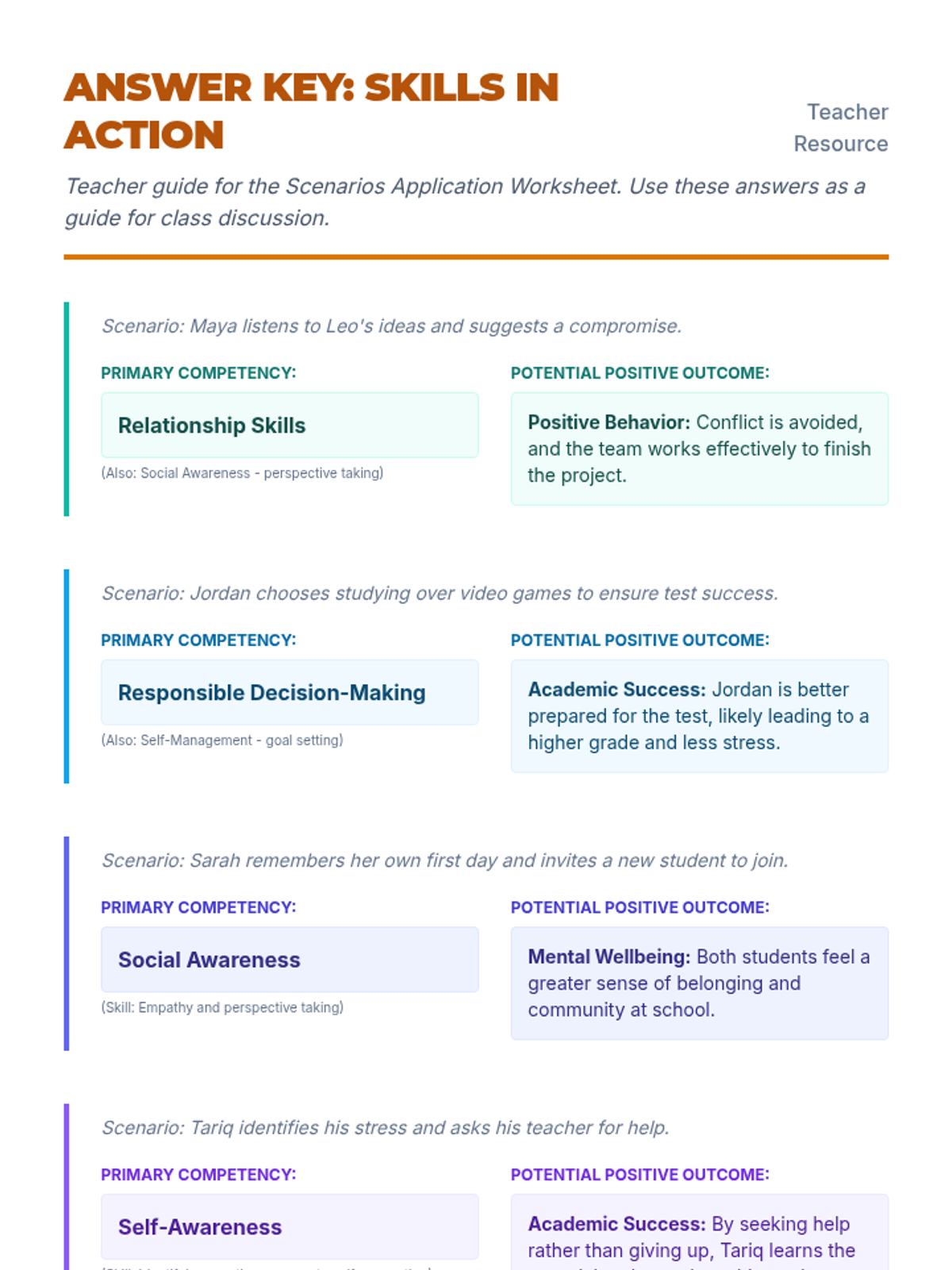 A detailed answer key for the Skills in Action Worksheet, providing the primary CASEL competency and a sample positive outcome for each school-based scenario.