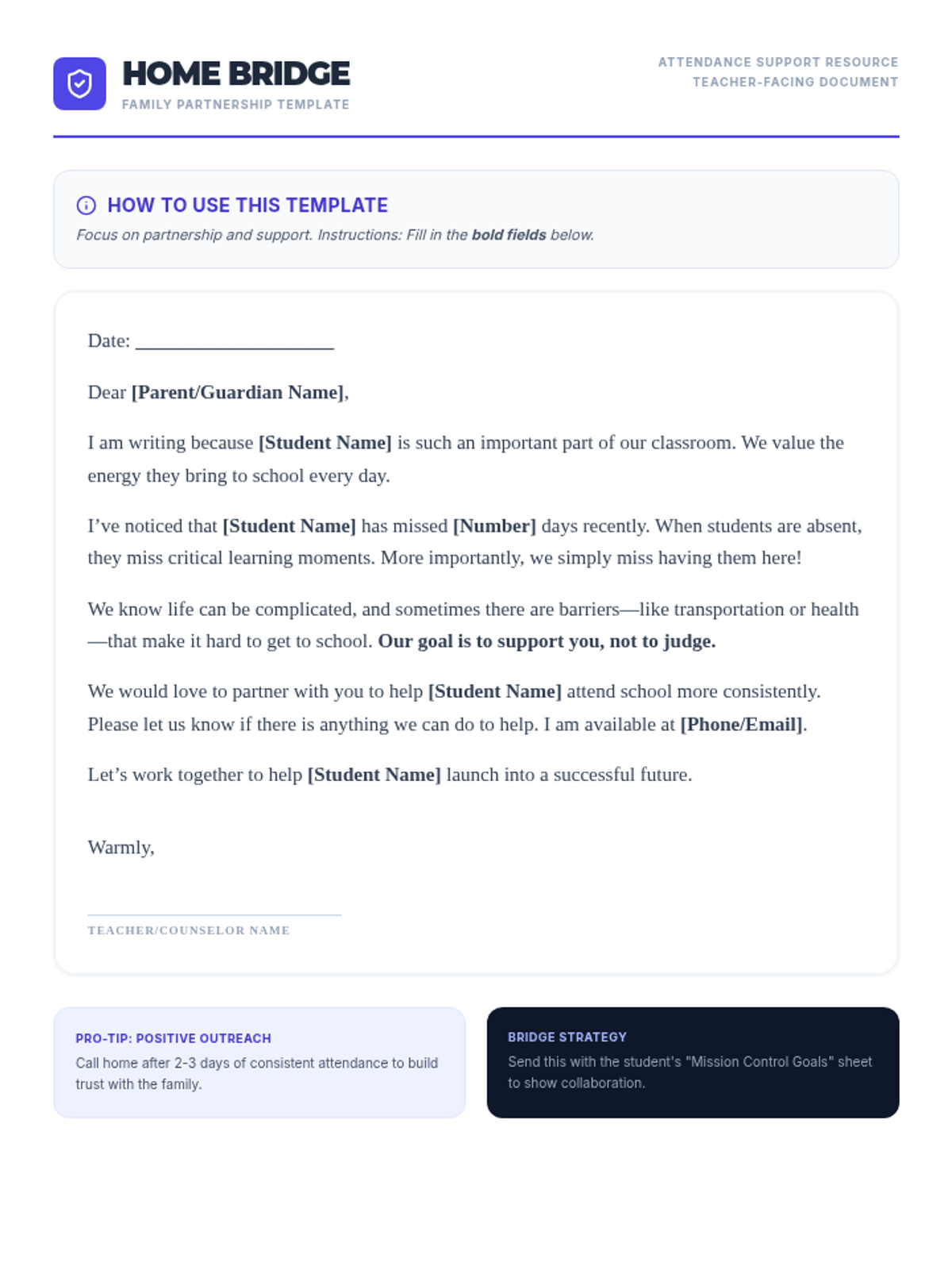 A teacher-facing outreach letter template designed to foster a supportive partnership between home and school regarding student attendance.