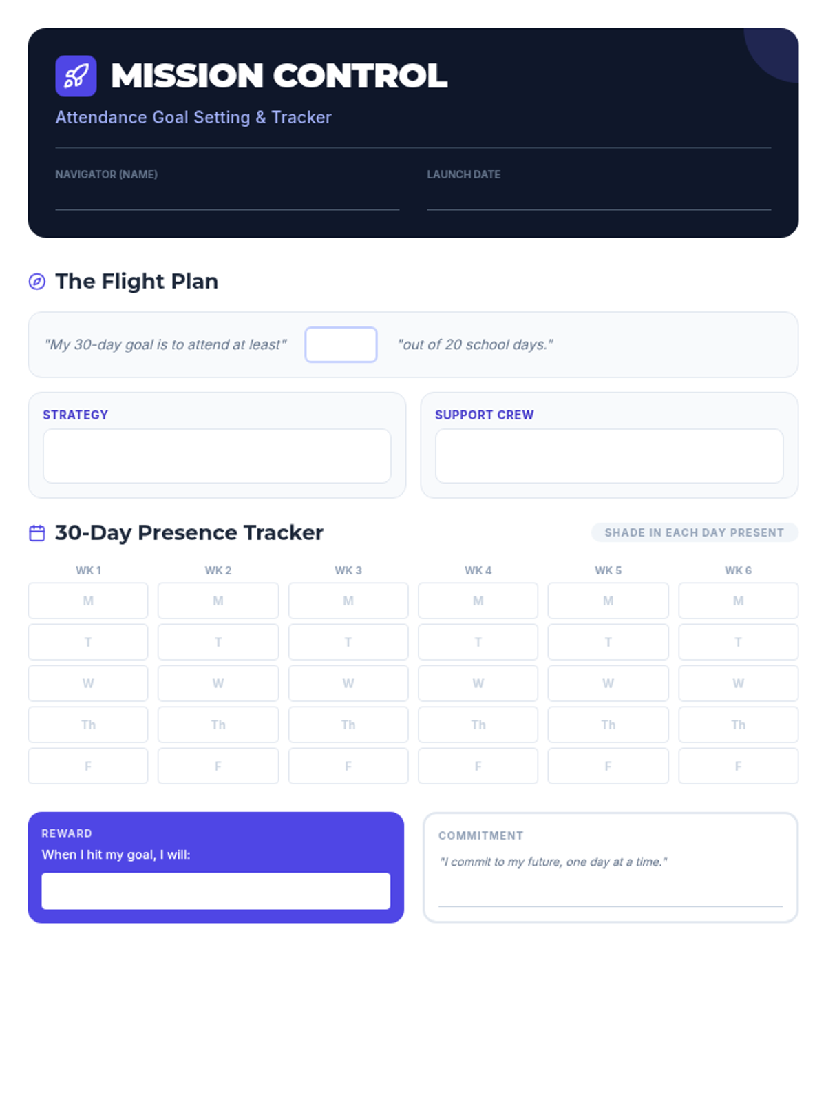 A goal-setting worksheet where students set a specific 30-day attendance goal, identify a strategy for success, and track their progress using a visual calendar.