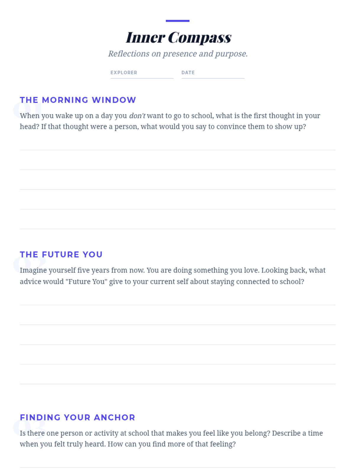 A set of deep reflection prompts for students to explore their personal connection to school and their aspirations for the future.