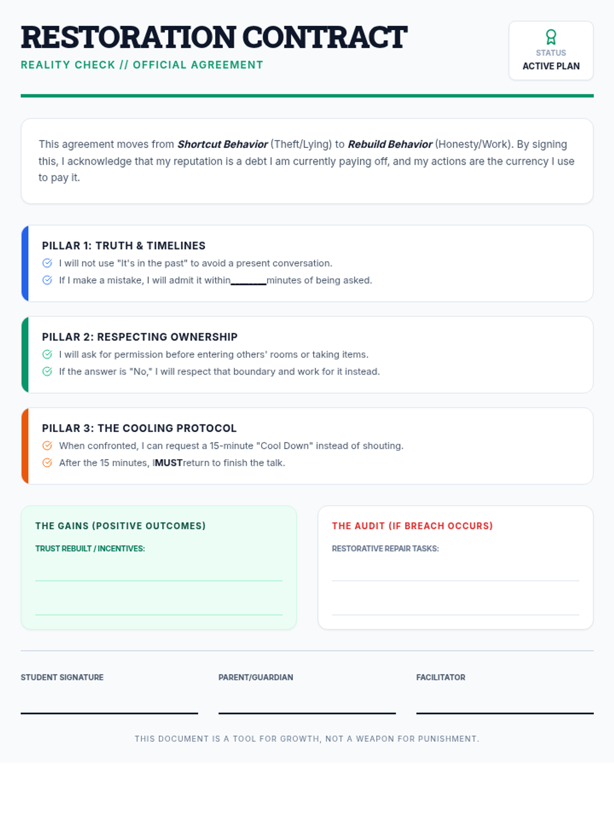 A collaborative restoration contract between the student, parents, and facilitator that defines clear behavioral pillars for honesty, respecting boundaries, and managing emotional shutdown.