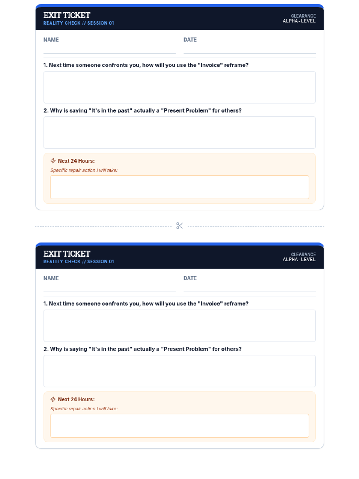 A compact exit ticket for students to reflect on the 'Invoice' reframe, the 'Past Myth,' and commit to one restorative action within the next 24 hours. Duplicate copies included on one page for efficient printing.