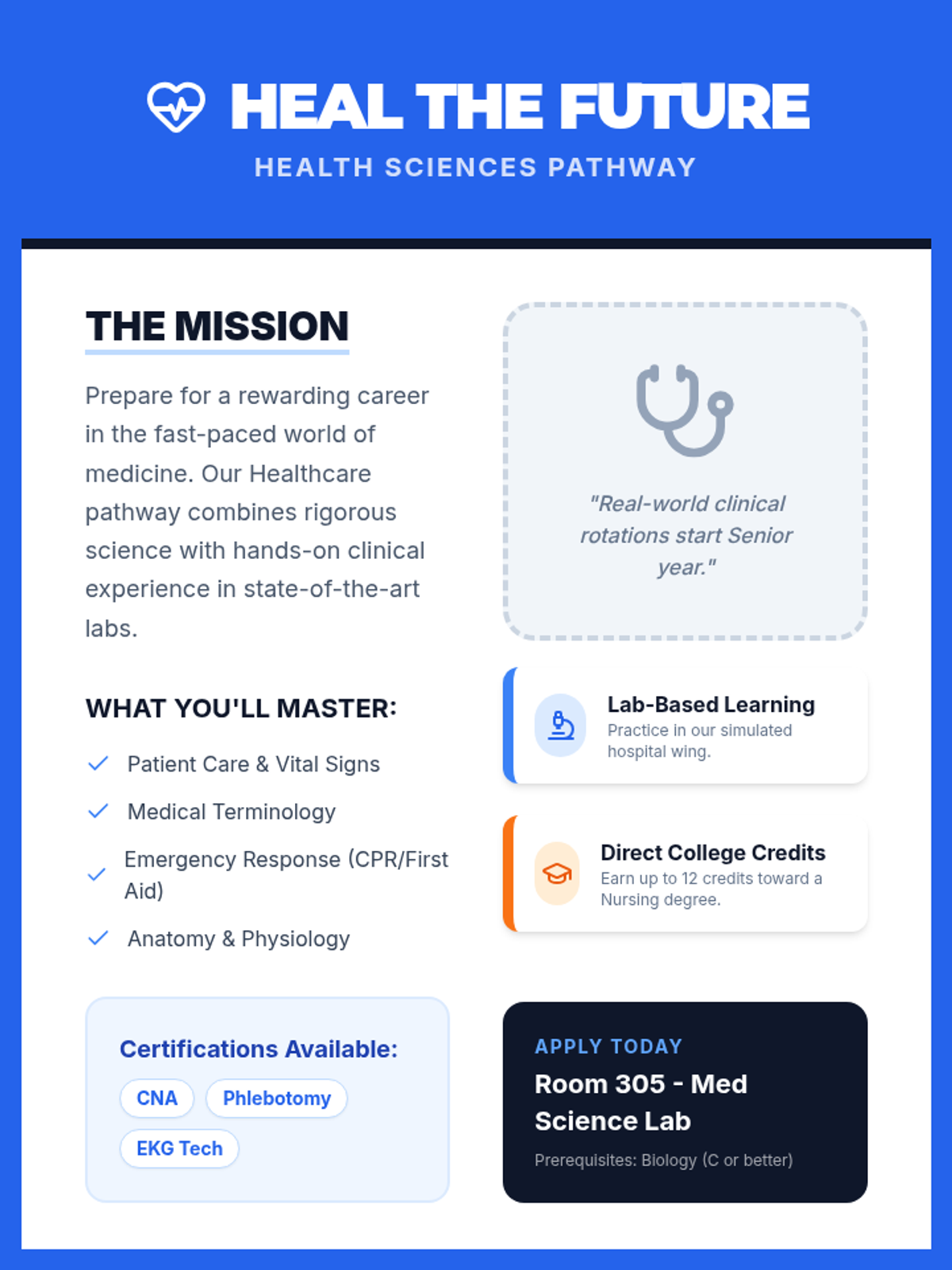 A specialized flyer for the Healthcare Pathway, highlighting technical skills, available industry certifications, and clinical experience opportunities.