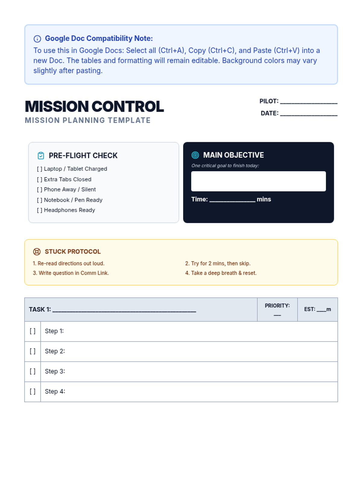 A simplified, table-based version of the Mission Control Planner designed for easy copy-pasting into Google Docs or Microsoft Word. It preserves the structured sections while using standard document formatting for better compatibility.