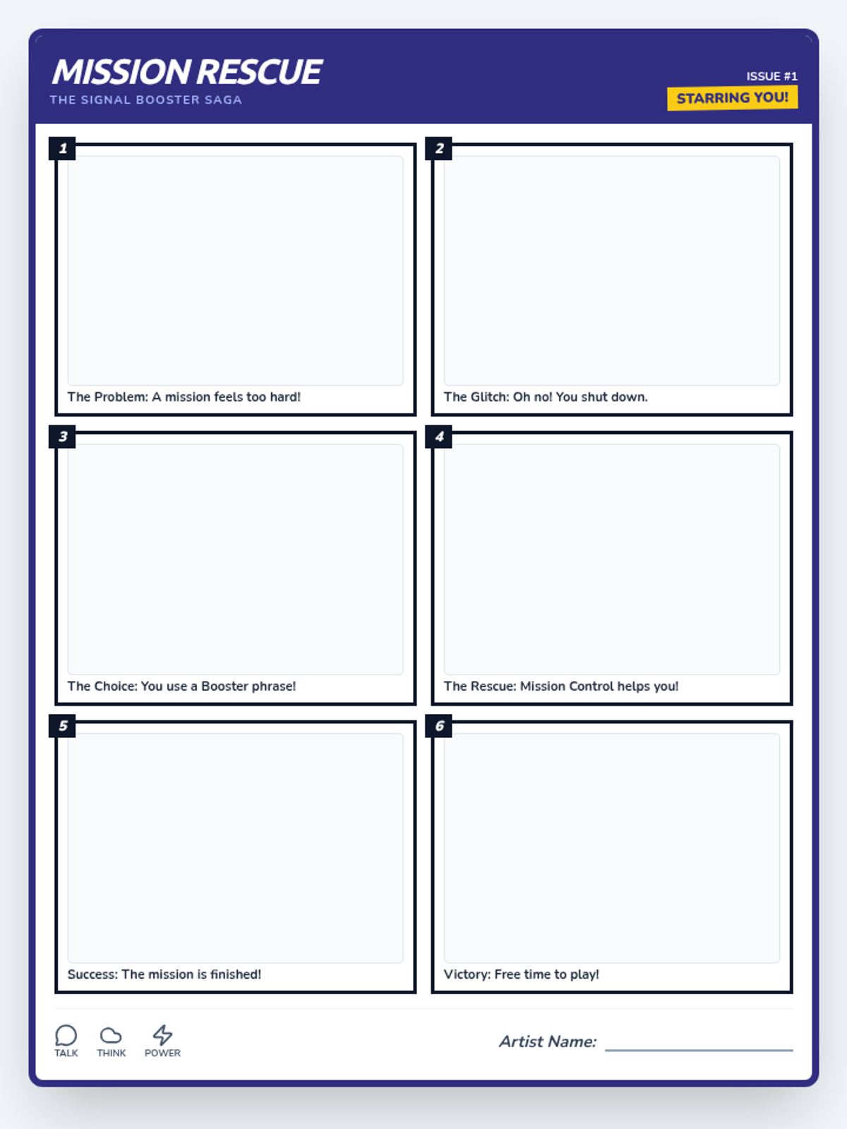 A comic strip template with six panels for students to illustrate a 'Signal Rescue'. Redesigned to fit on a single page with larger drawing areas and improved contrast.