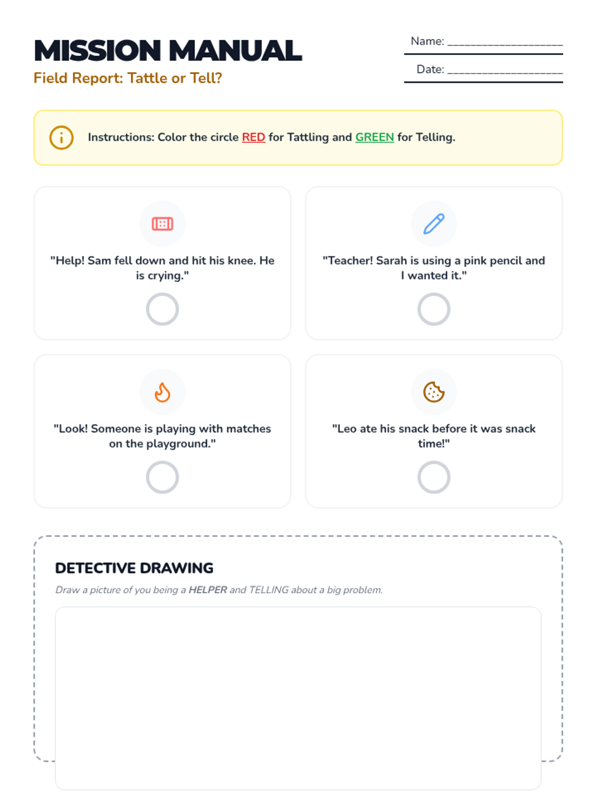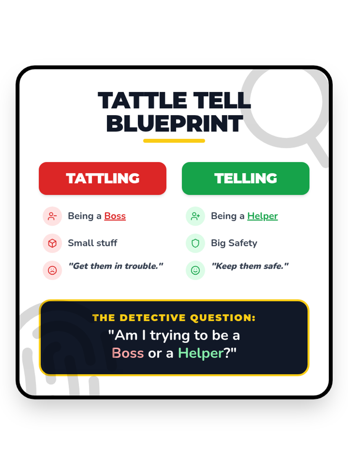 A visual anchor chart template summarizing the key differences between tattling and telling. It uses a high-contrast 'Boss vs. Helper' framework to make the concept accessible for 1st-grade students. Designed to fit on a single page.