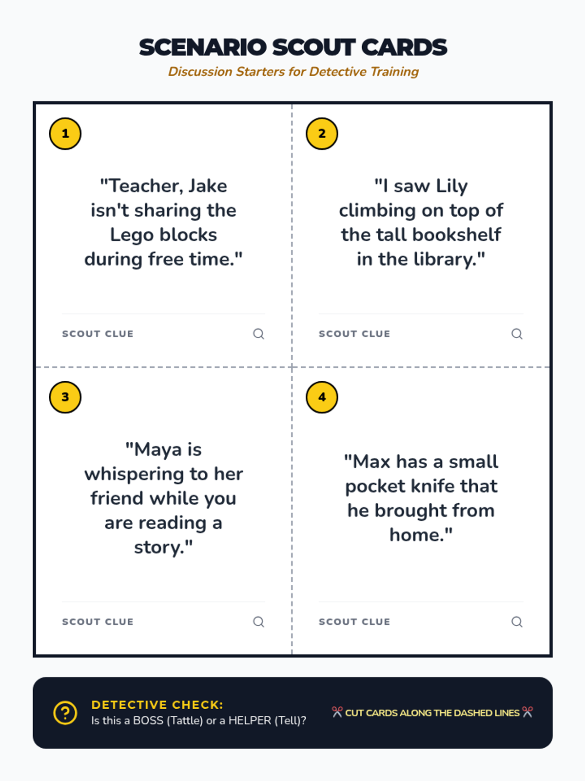 A set of 4 large-format scenario cards designed for classroom discussion or a physical sorting game. Each card presents a relatable school scenario for students to analyze through the 'Detective' lens. Cards include dashed cut-lines for easy preparation.