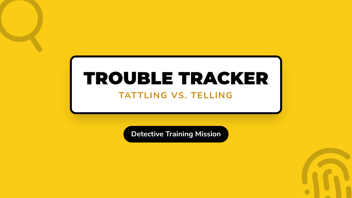 Engaging presentation slides for 1st graders featuring a 'Detective' theme. The slides visually contrast 'Tattling' (getting someone in trouble) versus 'Telling' (keeping someone safe) using bright colors, large text, and clear icons.
