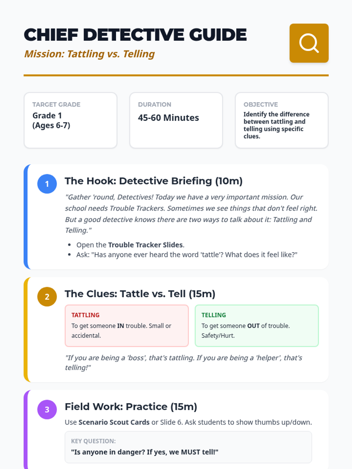 A comprehensive lesson plan for teachers, featuring a 'Detective' theme. It includes a scripted introduction, step-by-step instructional guidance, and specific prompts to help students distinguish between tattling and telling.